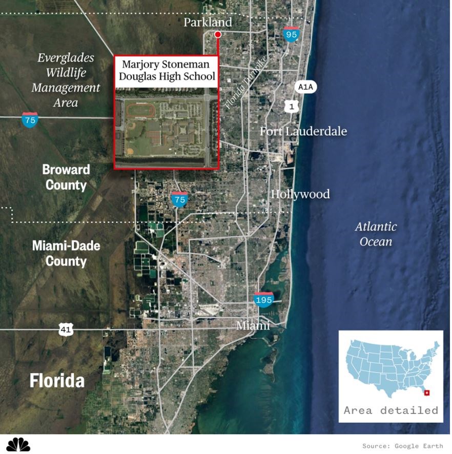 Το μακελειό, ένα από τα χειρότερα στις ΗΠΑ τα τελευταία 25 χρόνια, διαπράχθηκε την Τετάρτη, λίγη ώρα πριν ολοκληρωθούν τα τελευταία μαθήματα στο λύκειο Μάρτζορι Στόουνμαν Ντάγκλας στην Πάρκλαντ, μια πόλη με περίπου 30.000 κατοίκους.