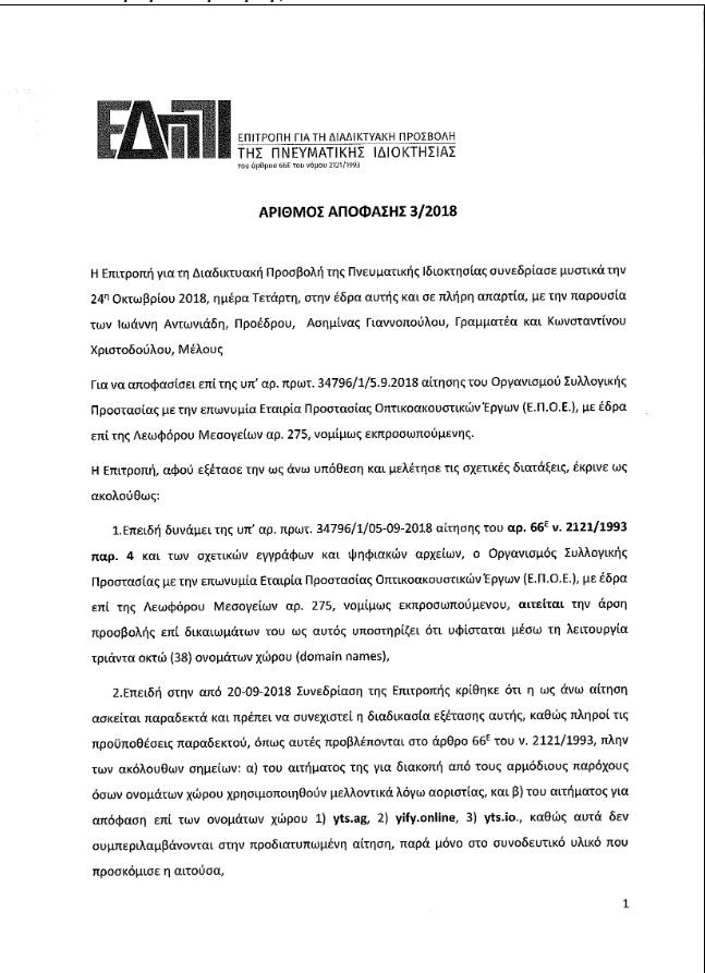 Άσχημα νέα για όσους «κατέβαζαν» όλες τις ταινίες και τις σειρές από το διαδίκτυο. Τα μεγαλύτερα sites με «δωρεάν» περιεχόμενο, έκλεισαν.Η εξέλιξη έρχεται μετά την πρώτη απόφαση της Επιτροπής για τη Διαδικτυακή Προσβολή Δικαιωμάτων Πνευματικής Ιδιοκτησίας (ΕΔΠΠΙ). Η Επιτροπή ξεκίνησε τη λειτουργία της στον Σεπτέμβριο και με την πρώτη της απόφαση κατεβάζει τους διακόπτες σε 38 sites με ταινίες και ξένες σειρές.Η απόφαση εκδόθηκε στις 6 Νοεμβρίου και οι πάροχοι είχαν προθεσμία 48 ωρών να διακόψουν την πρόσβαση, αλλιώς απειλούνταν με πρόστιμο 850 ευρώ για κάθε μέρα που δεν θα συμμορφώνονταν.Η διάρκεια της διακοπής ορίστηκε στα τρία χρόνια από την ημέρα κοινοποίησης της απόφασης.Όλη η λίστα με τα sites που δεν λειτουργούν πια1. xrysoi.online2. xrysoi.se3. xrysoi.eu4. gamatotv.me5. thegmtv.org6. gamatotv.to7. onlinemoviestar.xyz8. onlinemoviestar.com9. tainies.online10. tenies.online11. https://tenies-online.com12. teniesonline.ucoz.com13. https://oipeirates.οnline14. oipeirates.eu15. oipeirates.se16. tainio-mania.com17. tainiomania.ucoz.com18. liomenoi.com19. moviecinema.gr20. moviecinematv.online21. tainiesonline.tv22. magico.info23. subs4free.com24. small-industry.com25. medium-industry.com26. subztv.club27. reeksubtitles.info28. subtitles.gr29. thepiratebay.org30. thepiratebay.se31. thepiratebay.me32. thepiratebay3.org33. yts.am34. 1337x.tο35. 1337x.st36. 1337x.ws37. 1337x.eu38. 1337x.se