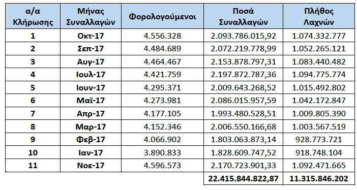 Σύμφωνα με την ανακοίνωση της ΑΑΔΕ, οι φορολογούμενοι που συμμετείχαν στις 11 δημόσιες κληρώσεις ανέρχονται σε 6.002.474. Συνολικά, συμπεριλαμβανομένης της κλήρωσης στις 30/11/2017, προέκυψαν 10.963 τυχεροί. Οι 10.930 από αυτούς κερδίζουν από 1.000 €, 29 κερδίζουν από 2.000 € και 4 κερδίζουν από 3.000 €.