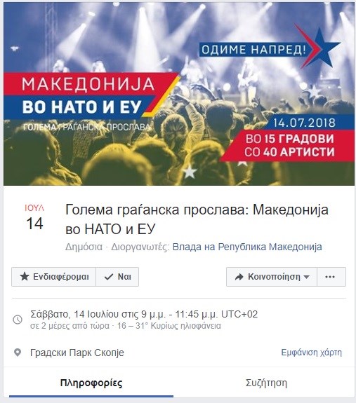 Η διαφήμιση της συγκεκριμένης εκδήλωσης αναφέρει ότι γίνεται με σκοπό ”να ενωθούμε και να γιορτάσουμε μαζί την ιστορική επιτυχία της Μακεδονίας”,ενώ το προεκλογικό σύνθημα της κυβέρνησης ενόψει δημοψηφίσματος είναι ”Πάμε Μπροστά- Η Μακεδονία στο ΝΑΤΟ και την Ε.Ε ”. Δείτε το βίντεο από το δελτίο ειδήσεων του Ant1: