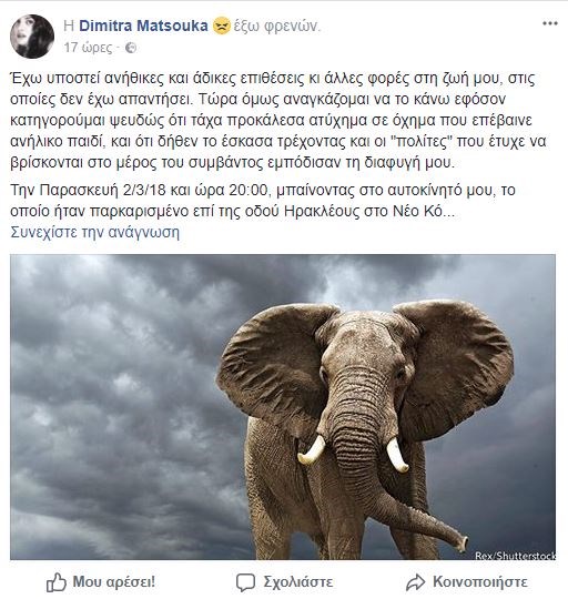 Τη δική της απάντηση για το τροχαίο στο οποίο ενεπλάκη πριν από λίγες ημέρες, έδωσε η Δήμητρα Ματσούκα, μέσω μίας μακροσκελούς ανάρτησής της στο Facebook.