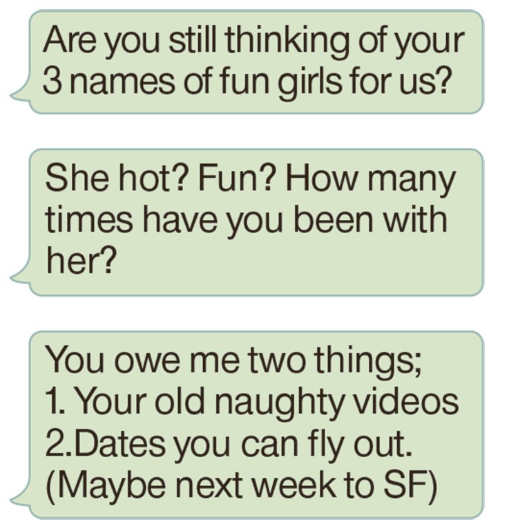 Η Ζόε Γκρέγκορι ισχυρίζεται ότι ο 43χρονος αθλητής την πολιορκεί με μηνύματα ζητώντας από την αυτήν να κάνουν τρίο, αλλά και υλικό ερωτικού περιεχομένου, όπως φωτογραφίες και βίντεο, ενώ παράλληλα απαιτεί να βρεθούν διά ζώσης και να φέρει και φίλες της για να ικανοποιήσουν τις ερωτικές του φαντασιώσεις. Και όλα αυτά έξι εβδομάδες πριν κάνει πρόταση γάμου στη 49χρονη σουπερστάρ.