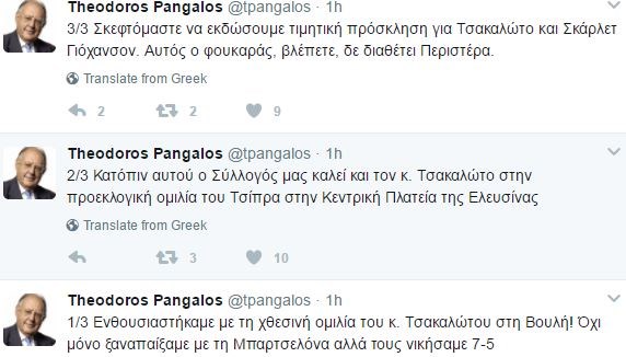 «Ενθουσιαστήκαμε με τη χθεσινή ομιλία του κ. Τσακαλώτου στη Βουλή! Όχι μόνο ξαναπαίξαμε με τη Μπαρτσελόνα αλλά τους νικήσαμε 7-5. Κατόπιν αυτού ο Σύλλογός μας καλεί και τον κ. Τσακαλώτο στην προεκλογική ομιλία του Τσίπρα στην Κεντρική Πλατεία της Ελευσίνας Σκεφτόμαστε να εκδώσουμε τιμητική πρόσκληση για Τσακαλώτο και Σκάρλετ Γιόχανσον. Αυτός ο φουκαράς, βλέπετε, δεν διαθέτει Περιστέρα», έγραψε o κ. Πάγκαλος.