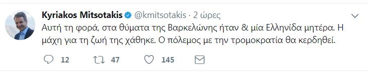 «Ο πόλεμος με την τρομοκρατία θα κερδηθεί», αναφέρει ο πρόεδρος της Νέας Δημοκρατίας Κυριάκoς Μητσοτάκης σε ανάρτησή του στο twitter.«Αυτή τη φορά, στα θύματα της Βαρκελώνης ήταν και μία Ελληνίδα μητέρα. Η μάχη για τη ζωή της χάθηκε. Ο πόλεμος με την τρομοκρατία θα κερδηθεί», γράφει χαρακτηριστικά στην ανάρτησή του ο πρόεδρος της ΝΔ.