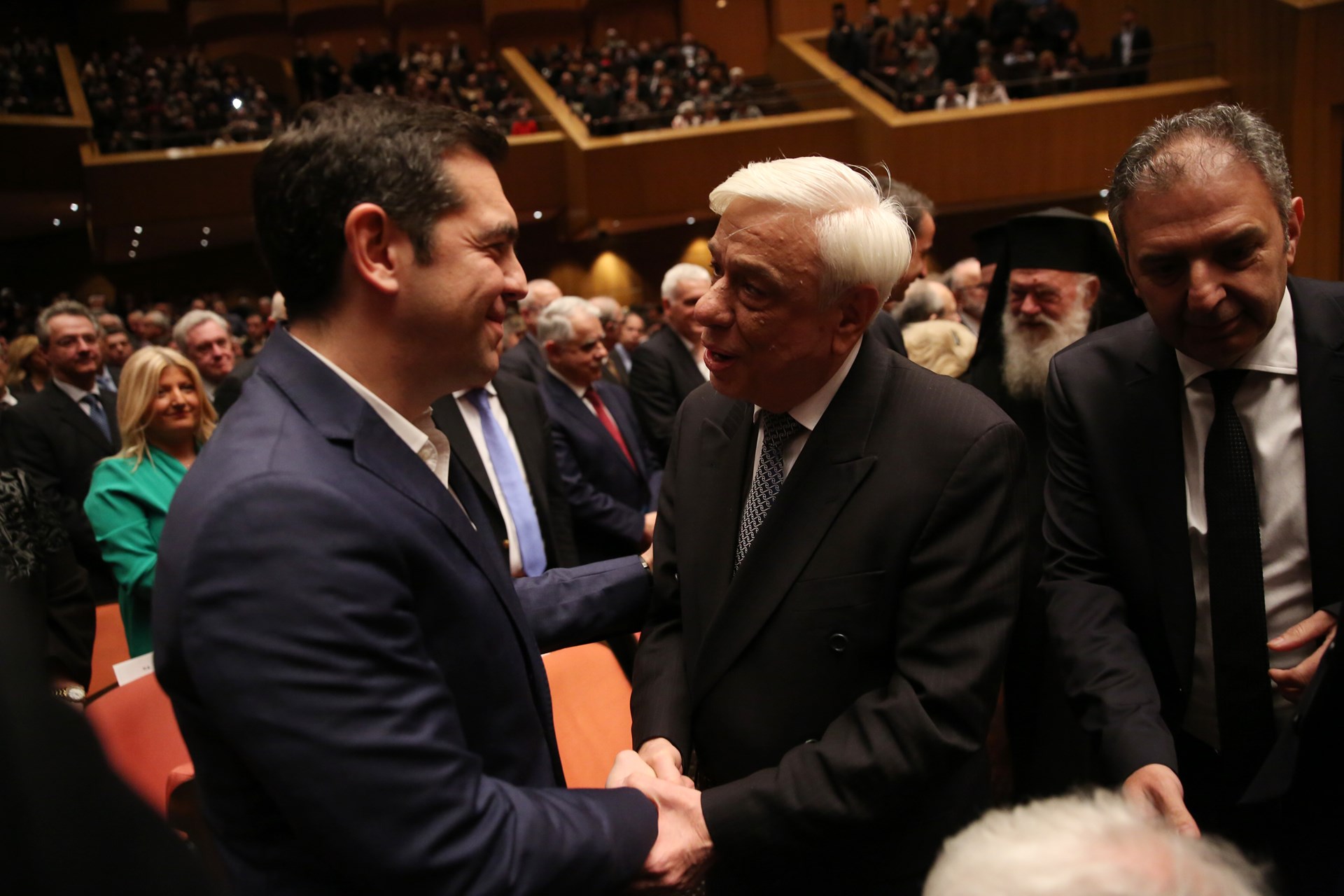 Οι δύο άνδρες συναντήθηκαν στο Μέγαρο Μουσικής, όπου φιλοξενήθηκε η εορταστική εκδήλωση για τα 10 χρόνια διακονίας του Αρχιεπισκόπου Ιερωνύμου από τον Αρχιεπισκοπικό Θρόνο. Και ο φωτογραφικός φακός «συνέλαβε» τους δύο άνδρες να έχουν θερμή χειραψία με πολλά χαμόγελα.