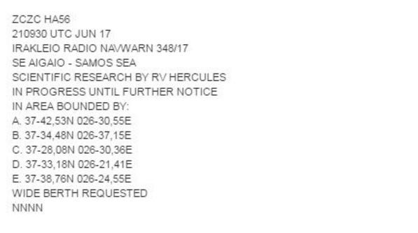 Ταυτόχρονα, να σημειώσουμε ότι η ελληνική NAVTEX αναφέρεται σε έρευνες του πλοίου RV HERCULES που πραγματοποιούνται κοντά στο σύμπλεγμα των Φούρνων, στην περιοχή Σάμου.