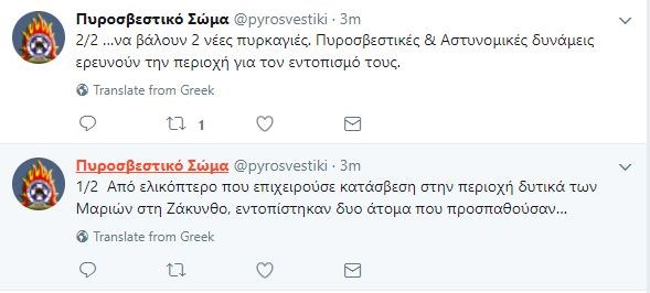 Δύο άτομα που προσπαθούσαν να βάλουν 2 νέες πυρκαγιές στη Ζάκυνθο, εντοπίστηκαν από ελικόπτερο που επιχειρούσε κατάσβεση στην περιοχή δυτικά των Μαριών, αναφέρει η Πυροσβεστική.