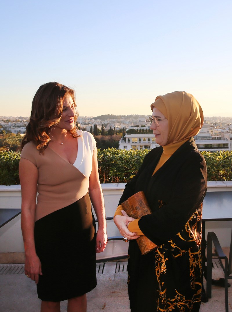 Η Εμινέ Ερντογάν προσκάλεσε τη σύντροφό του πρωθυπουργού, Μπέτυ Μπαζιάνα, στο ξενοδοχείο, για να πιουν τσάι, καθώς λόγω της αδιαθεσίας της αναβλήθηκε η επίσκεψή τους στο Μουσείο της Ακρόπολης.