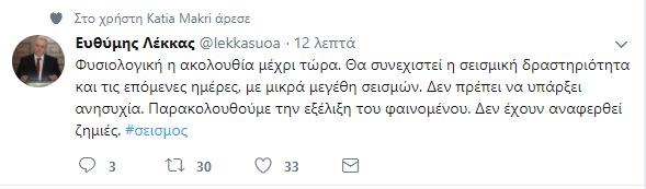 «Η σεισμική δραστηριότητα θα συνεχιστεί και τις επόμενες μέρες, με μικρά μεγέθη σεισμών», κάνει λόγο σε ανάρτησή στον προσωπικό του λογαριασμό στο Twitter ο πρόεδρος του ΟΑΣΠ, Ευθύμης Λέκκας χαρακτηρίζοντας ως «φυσιολογική την ακολουθία μέχρι τώρα».