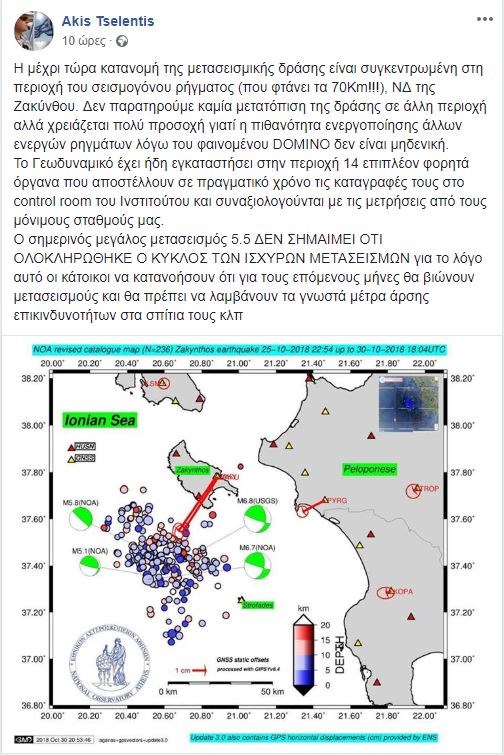 “Η μέχρι τώρα κατανομή της μετασεισμικής δράσης είναι συγκεντρωμένη στη περιοχή του σεισμογόνου ρήγματος (που φτάνει τα 70Km!!!), ΝΔ της Ζακύνθου. Δεν παρατηρούμε καμία μετατόπιση της δράσης σε άλλη περιοχή αλλά χρειάζεται πολύ προσοχή γιατί η πιθανότητα ενεργοποίησης άλλων ενεργών ρηγμάτων λόγω του φαινομένου DOMINO δεν είναι μηδενική.