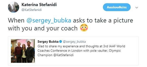 Όπως έγραψε χαρακτηριστικά στον επίσημο λογαριασμό της στο twitter η Ελληνίδα πρωταθλήτρια: “Όταν ο Σεργκέϊ Μπούμπκα σου ζητά να βγάλει μία φωτογραφία με εσένα και τον προπονητή σου”.