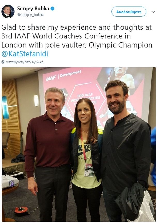 Πρώτος που ανέβασε τη φωτογραφία ήταν ο Σεργκέι Μπούμπκα ο οποίος έγραψε: “Είμαι χαρούμενος που μοιράστηκα την εμπειρία και τις γνώσεις μου στο τρίο συνέδριο προπονητών της IAAF στο Λονδίνο με την επικοντίστρια και Ολυμπιονίκη, Κατερίνα Στεφανίδη”