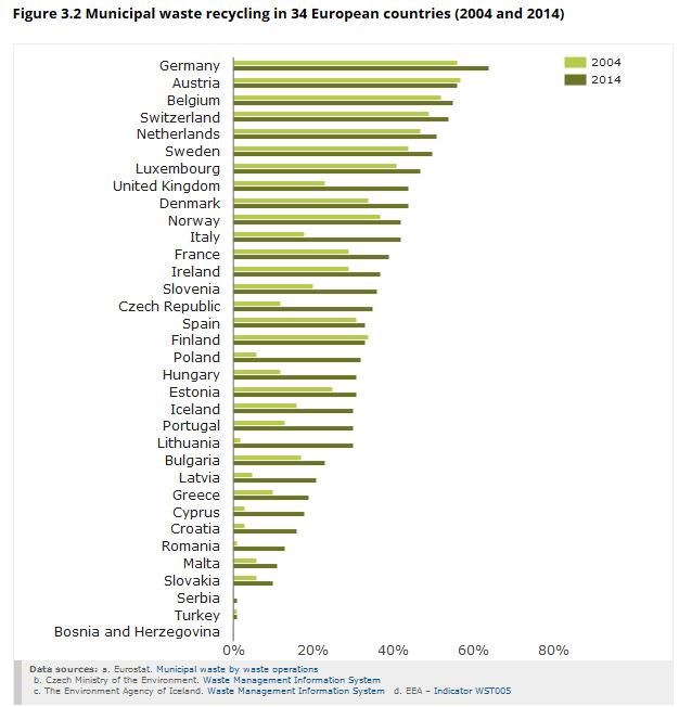 Αυστρία: Η Αυστρία είναι μια από τις πιο εξελιγμένες χώρες στην Ευρώπη σε ό,τι αφορά στην εφαρμογή των πρακτικών διαχείρισης απορριμμάτων, με άρτια οργανωμένες μονάδες διαλογής και κομποστοποίησης απορριμμάτων, εργοστάσια σύνθετης επεξεργασίας πολλών ταυτόχρονα ρευμάτων ανακυκλώσιμων υλικών και με εργοστάσια καύσης.