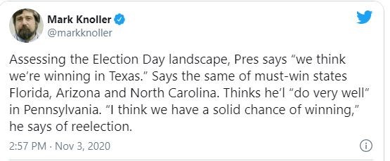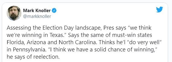 Ενώ είχε αναφερθεί ότι αν έχει ένα σαφές προβάδισμα σύμφωνα με τα αποτελέσματα την Τρίτη το βράδυ θα κήρυσσε τη νίκη, το διέψευσε κάνοντας λόγο για “ψευδή αναφορά” και όταν ρωτήθηκε την Τρίτη το πρωί στο Fox, απέρριψε την ιδέα της πρόωρης ανακήρυξης νίκης τονίζοντας ότι θα προβεί σε ανακοινώσεις μόνο όταν υπάρξει νίκη και ότι δεν υπάρχει λόγος να παίζει παιχνίδια: “Όταν υπάρχει νίκη, αν υπάρχει νίκη, θα κηρύξω νίκη… Πιστεύω ότι θα νικήσουμε, μόνο αν υπάρχει νίκη, δεν υπάρχει λόγος να παίζω παιχνίδια, υπάρχει μεγάλη πιθανότητα να κερδίσω, δεν ξέρω ποιες είναι οι πιθανότητες, αλλά έχουμε μεγάλη πιθανότητα να κερδίσω” επέμεινε ο απερχόμενος πρόεδρος των ΗΠΑ που διεκδικεί την επανεκλογή του ενώ στη συνέχεια τόνισε ότι “θα κερδίσω τουλάχιστον 306 εκλέκτορες”.