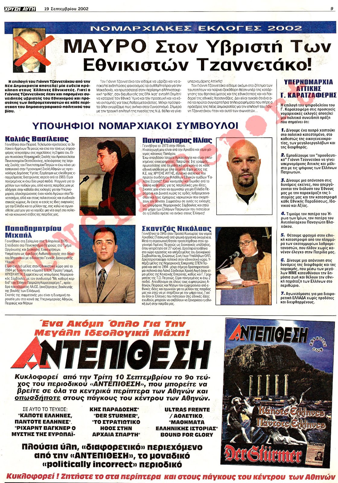 Τότε που η εφημερίδα της «Χρυσής Αυγής» (19/9/2002) διαφήμιζε τους υποψηφίους της για την υπερνομαρχία Αττικής, που είχαν βρει στέγη στο ψηφοδέλτιο του Καρατζαφέρη και του ΛΑΟΣ, κόμματος (τότε) του Άδωνι Γεωργιάδη… (η φωτογραφία είναι από το «jungle-report.blogspot.gr»].