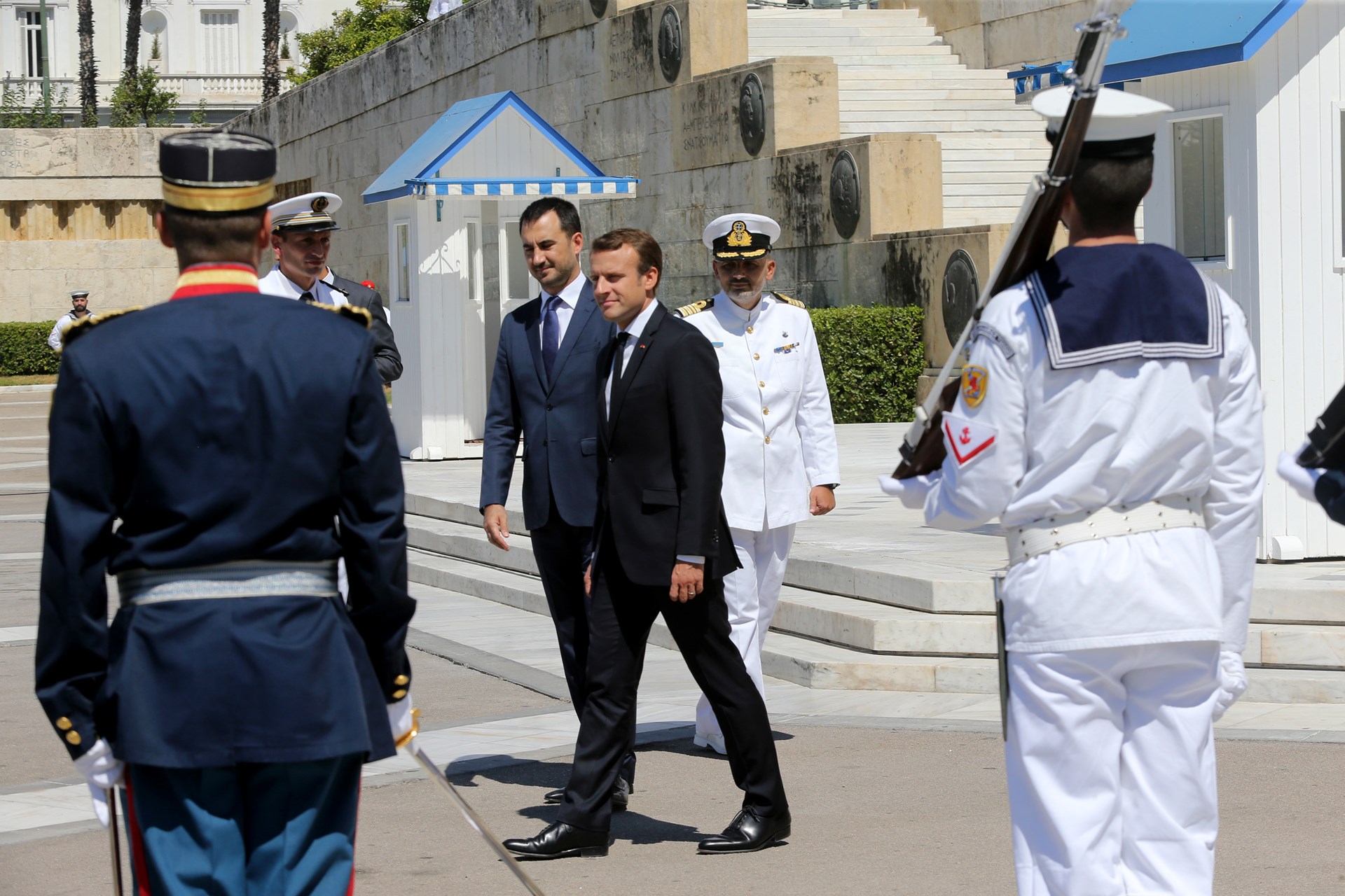 Στη συνέχεια, ο Εμανουέλ Μακρόν κατέθεσε στεφάνι στο Μνημείο του Αγνώστου Στρατιώτη.