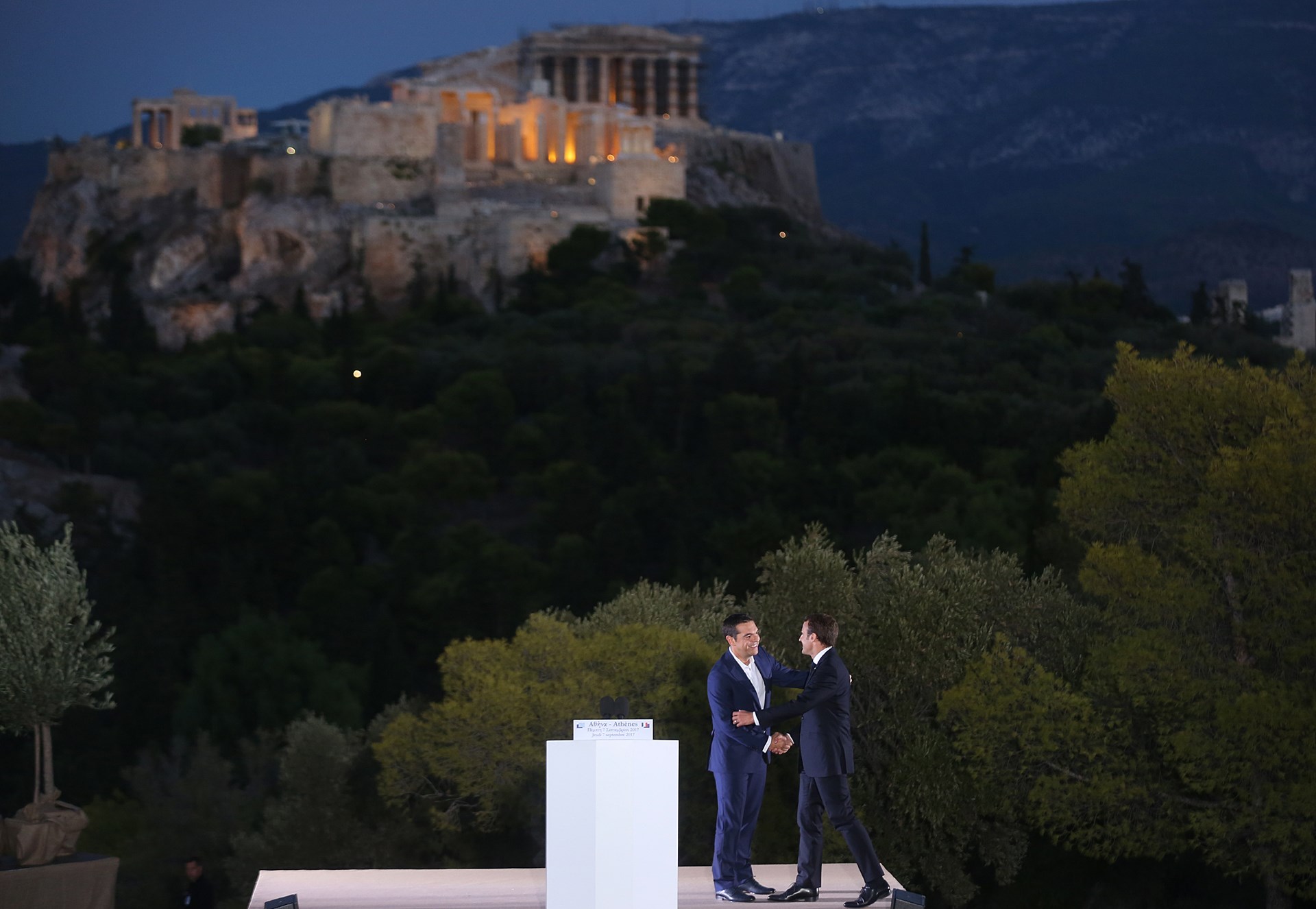 Ο πρωθυπουργός Αλέξης Τσίπρας αφού καλωσόρισε τον Πρόεδρο της Γαλλίας, στον τόπο που η δημοκρατία έκανε τα πρώτα της βήματα και άναψε τη φλόγα για να φωτίσει όλη την οικουμένη τόνισε: στέλνουμε ένα μήνυμα σε ολόκληρο τον κόσμο. Είμαστε αποφασισμένοι να προωθήσουμε τον διάλογο για ένα νέο συμβόλαιο δημοκρατίας και αλληλεγγύης. Για μια επανίδρυση. Ισονομία μεταξύ των πολιτών και των κρατών».