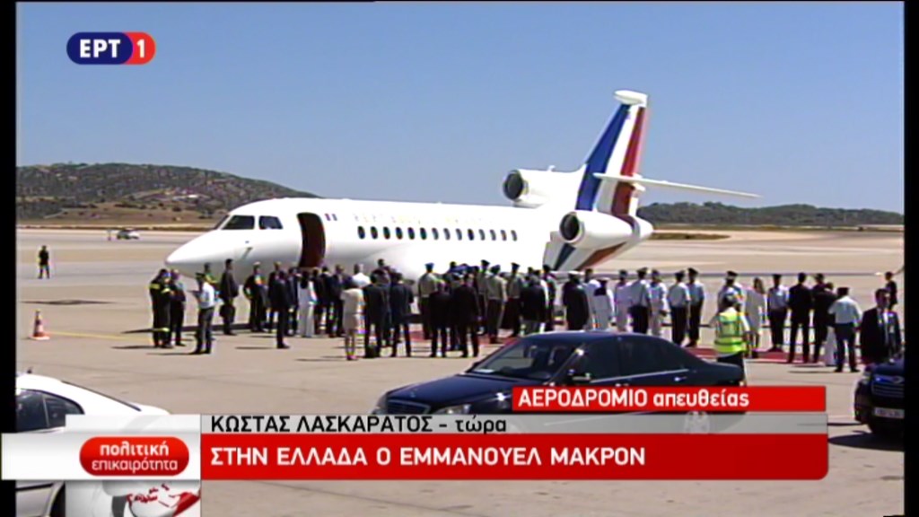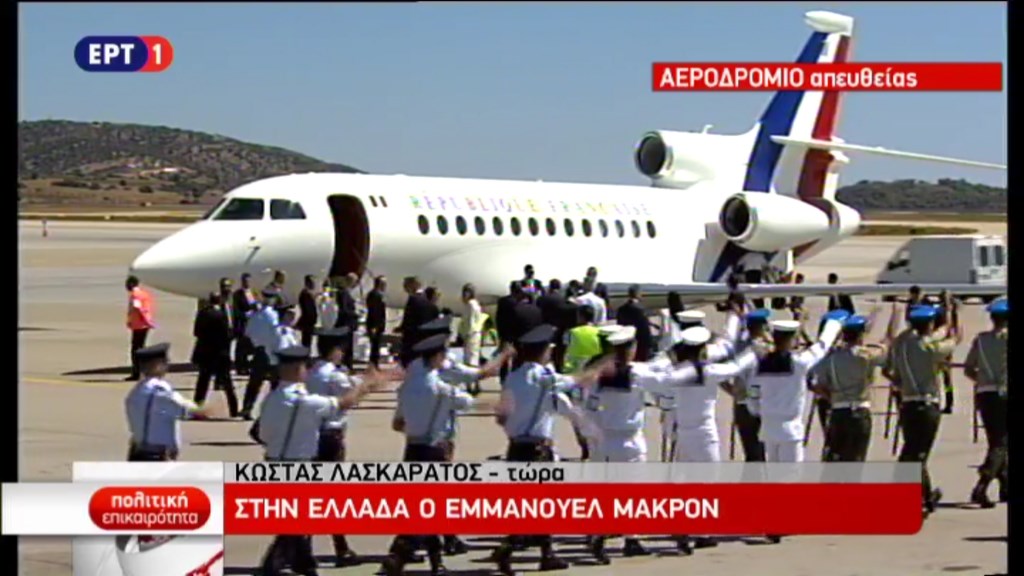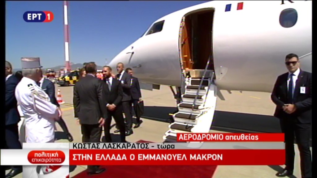 Ο Μακρόν έφθασε λίγο μετά τη μία το μεσημέρι συνοδευόμενος από τη σύζυγό του,Μπριζίτ. Στο αεροδρόμιο “Ελευθέριος Βενιζέλος” τους υποδέχθηκε ο κυβερνητικός εκπρόσωπος και υπουργός Επικρατείας, Δημήτρης Τζανακόπουλος. Λίγο αργότερα μετέβησαν στο Προεδρικό Μέγαρο, όπου τους υποδέχθηκε ο Έλληνας ομόλογός του κ. Προκόπης Παυλόπουλος και η σύζυγός του Βλασία Παυλοπούλου.
