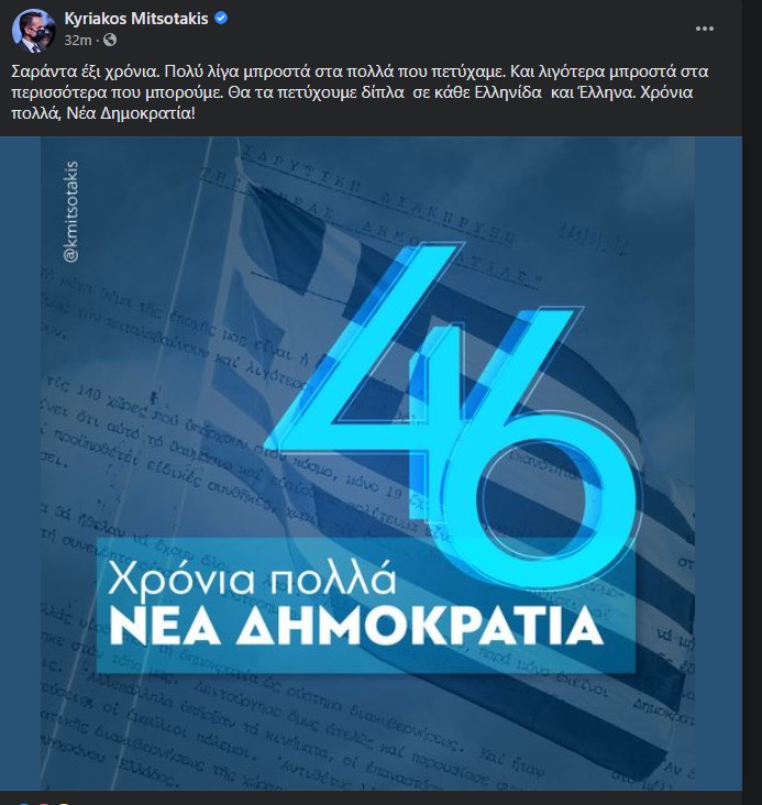 Με ανάρτηση του στο Facebook o Πρωθυπουργός, Κυριάκος Μητσοτάκης, αναφέρεται στην επέτειο για τα 46 χρόνια από την ίδρυση της ΝΔ.
