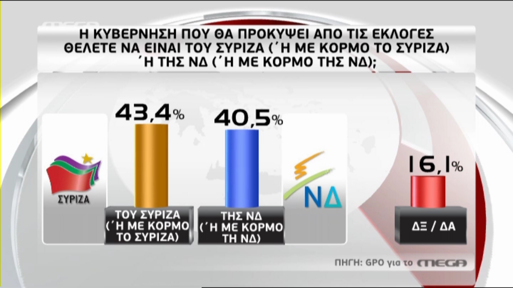Το 43,4% επιθυμεί να προκύψει από τις εκλογές μια κυβέρνηση του ΣΥΡΙΖΑ (ή με κορμό του ΣΥΡΙΖΑ), ενώ το 40,5% επιθυμεί μια κυβέρνηση ΝΔ (ή με κορμό τη ΝΔ)