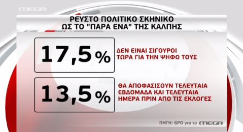 Το πολιτικό σκηνικό όπως αποτυπώνεται στη δημοσκόπηση είναι ρευστό καθώς το 17,5% των ερωτηθέντων δεν είναι σίγουροι τώρα για την ψήφο τους, ενώ το 13,5% θα αποφασίσουν τελευταία εβδομάδα και τελευταία μέρα πριν από τις εκλογές.