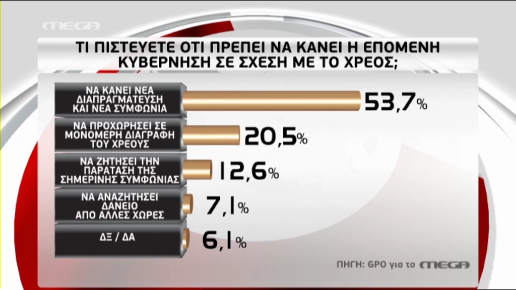 Αναφορικά με το χρέος, το 53,7% πιστεύει ότι η επόμενη κυβέρνηση πρέπει να κάνει νέα διαπραγμάτευση και νέα συμφωνία.