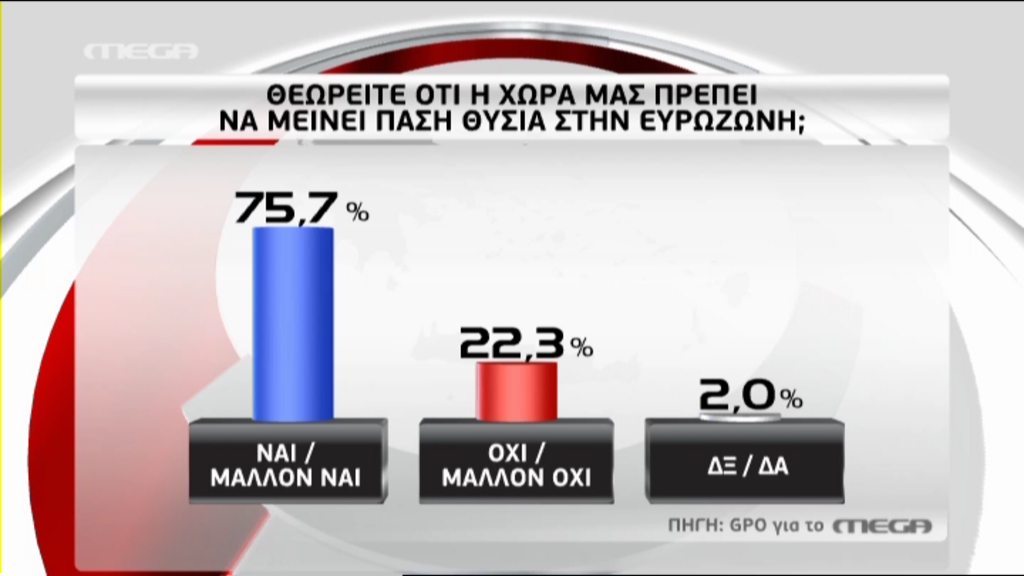 Σχετικά με τα σενάρια περί Grexit, το 75,7% θεωρεί ότι η χώρα πρέπει να μείνει πάση θυσία στην ευρωζώνη, ενώ το 22,3% πιστεύει ότι πρέπει να συμβεί το αντίθετο.
