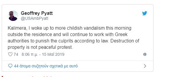 Για την επίθεση στο σπίτι του το πρωί, από ομάδα 10 ατόμων που πέταξαν μπογιές και καπνογόνο, αναφέρεται σε ανάρτησή του στο twitter, ο Αμερικανός πρέσβης. Τζέφρι Πάιατ.«Καλημέρα, σήμερα ξύπνησα με έναν παιδαριώδη βανδαλισμό έξω από το σπίτι μου και θα συνεχίσω να εργάζομαι με τις ελληνικές αρχές για να τιμωρηθούν οι ένοχοι σύμφωνα με τον νόμο. Η καταστροφή της ιδιοκτησίας δεν είναι ειρηνική διαμαρτυρία», έγραψε χαρακτηριστικά ο Αμερικανός πρέσβης στον λογαριασμό του στο Twitter.