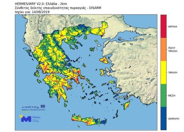 Παράλληλα, υψηλός και τοπικά πολύ υψηλός θα είναι ο κίνδυνος εκδήλωσης και εξάπλωσης πυρκαγιών σε πολλές περιοχές της χώρας και ιδιαίτερα στη Νότια Εύβοια, στην Αττική, στα νησιά του Ανατολικού Αιγαίου, στη Ρόδο και στη Νότια Κρήτη.