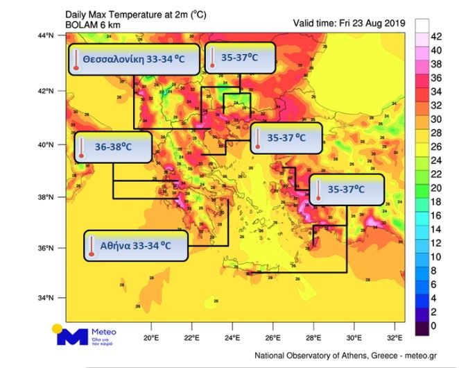 Σε υψηλά επίπεδα θα παραμείνει η θερμοκρασία σήμερα, φτάνοντας κατά τόπους τους 38 βαθμούς Κελσίου. Ο υδράργυρος αναμένεται να φτάσει τους 36-38 βαθμούς στη Δυτική Στερεά και τη Βορειοδυτική Πελοπόννησο, και τους 35-37 βαθμούς στη Μακεδονία, τη Θεσσαλία και τοπικά στα νησιά του Ανατολικού Αιγαίου και στη Νότια Κρήτη.