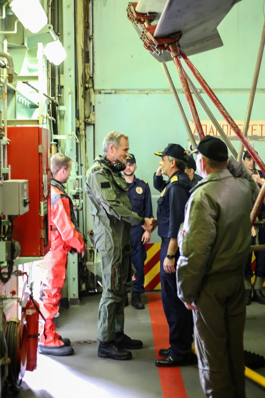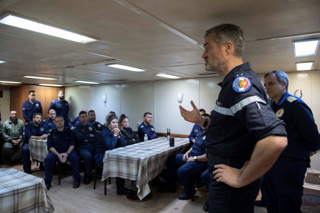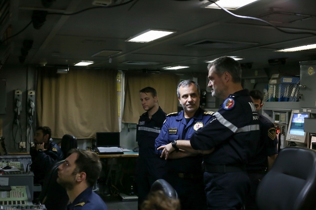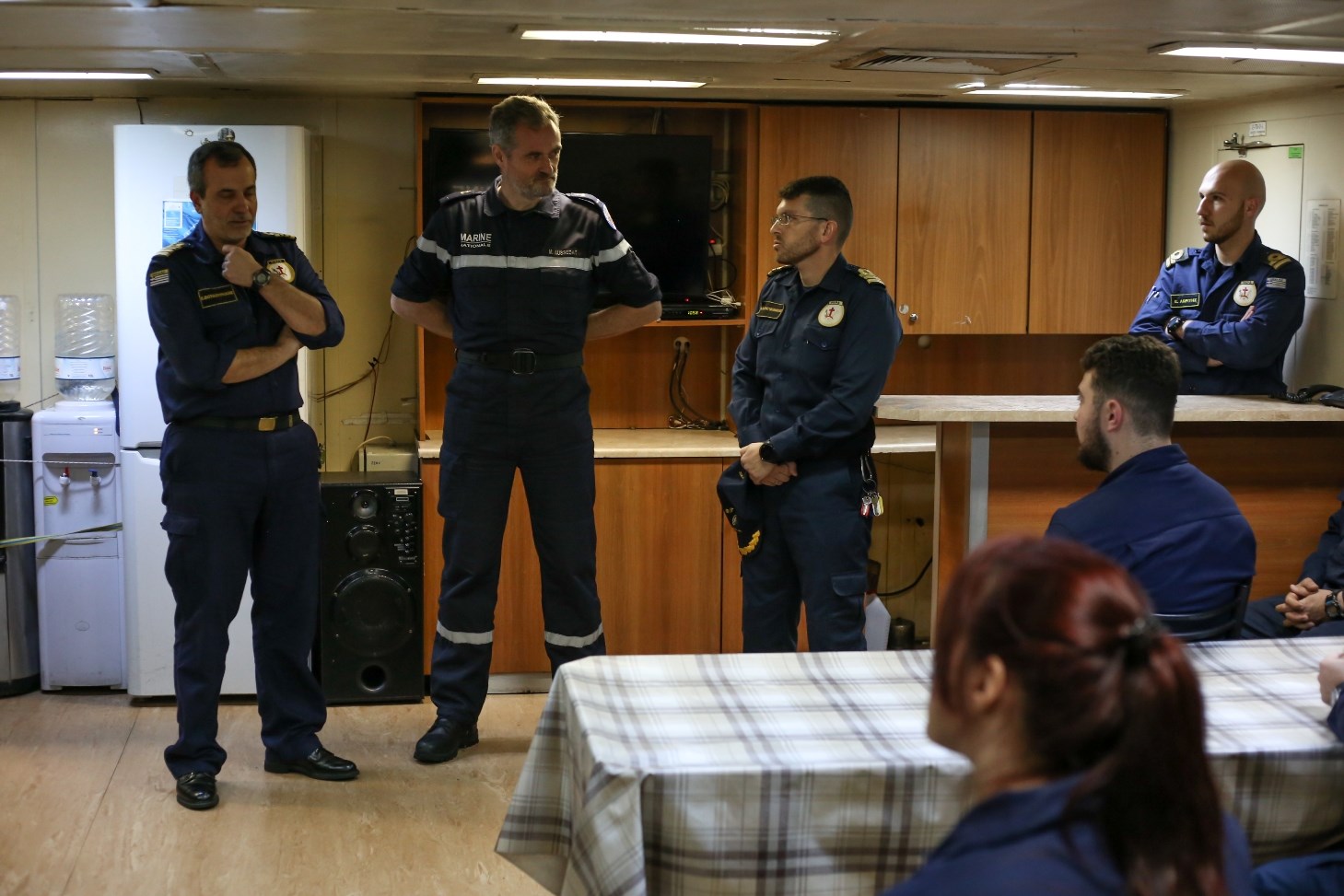 Ο Γάλλος Διοικητής ενημερώθηκε για τις δυνατότητες, τα χαρακτηριστικά του πλοίου και ξεναγήθηκε στους χώρους του, ενώ απηύθυνε σύντομο χαιρετισμό στο πλήρωμα τονίζοντας τη σημαντική συνεισφορά της Φρεγάτας «ΨΑΡΑ» στην ανωτέρω αποστολή.