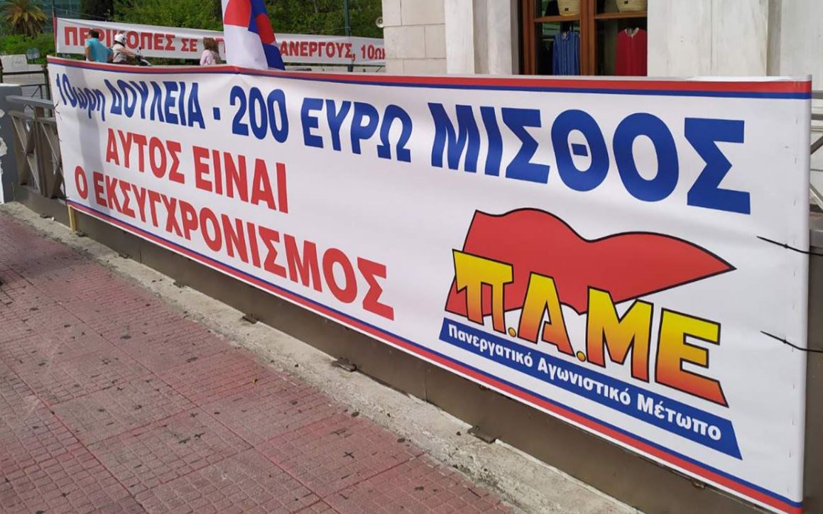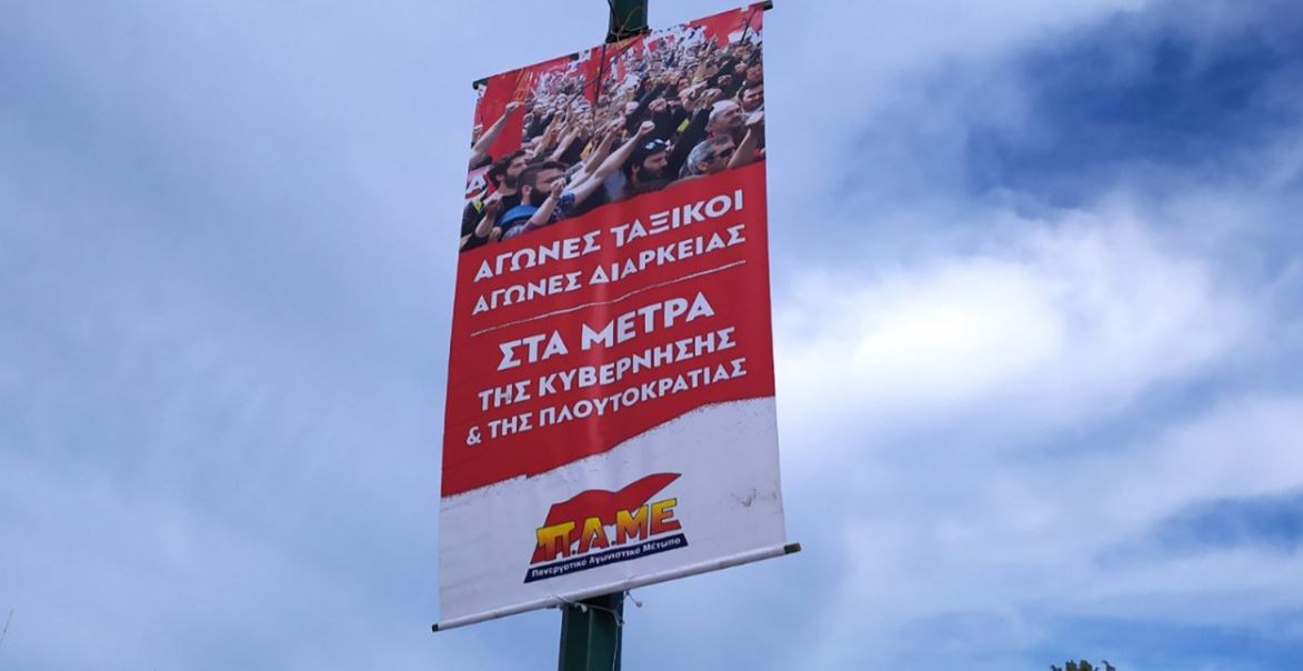 Στις κολόνες έχουν αναρτηθεί πανό τα οποία αναγράφουν: «Μη ματώνεις άλλο για την πλουτοκρατία, αγώνας τώρα για άλλη κοινωνία», «Αγώνες ταξικοί, αγώνες διαρκείας στα μέτρα της κυβέρνησης και της πλουτοκρατίας», «Κρίση – πόλεμοι – ξεριζωμός αυτός είναι ο καπιταλισμός», «135 χρόνια αγώνας. Κάτω τα χέρια από το οκτάωρο. Όχι στο νομοσχέδιο της κυβέρνησης. 7ωρο – 35ωρο – πενθήμερο» και «Επίταξη του ιδιωτικού τομέα της Υγείας, προσλήψεις μόνιμου ιατρικού και νοσηλευτικού προσωπικού».