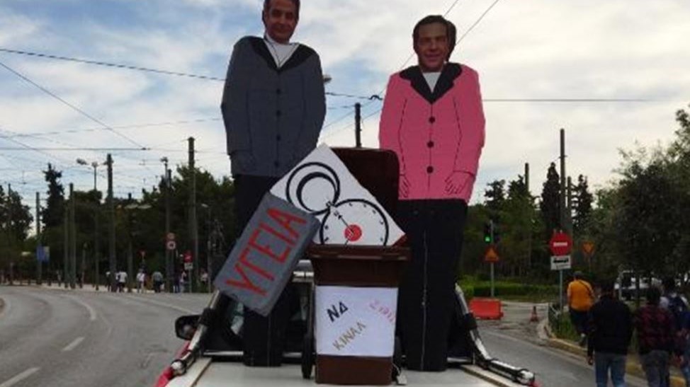Στους Στύλους τους Ολυμπίου Διός μαζεύονται Σωματεία και Επιτροπές Αγώνα στη δημόσια και ιδιωτική Υγεία, Σωματεία των ΟΤΑ, της Περιφέρειας, της Δημόσιας Διοίκησης, μαζικοί φορείς της Ανατολικής Αθήνας και των Νοτίων Προαστίων. Με ένα πρωτότυπο άρμα των εργαζομένων στους ΟΤΑ απεικονίζεται ο Κυριάκος Μητσοτάκης με τον Αλέξη Τσίπρα, οι οποίοι πετάνε στον σκουπιδοτενεκέ το 8ωρο και την υγεία, στηλιτεύοντας την πολιτική των δύο κομμάτων αλλά και του ΚΙΝΑΛ.