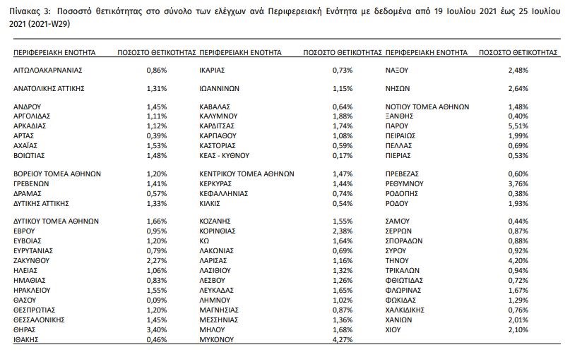Ενδεικτικά είναι τα στοιχεία που ανακοίνωσε ο ΕΟΔΥ την Τετάρτη, σχετικά με τα ποσοστά θετικότητας που καταγράφονται ανά περιοχή. Πρόκειται για συγκεντρωτικά στοιχεία της εβδομάδας 19 Ιουλίου 2021 – 25 Ιουλίου 2021 (2021-W29). Το συγκεκριμένο χρονικό διάστημα, το ποσοστό θετικότητας ήταν 3.26% σε σύνολο 540.283 εργαστηριακών ελέγχων (RT-PCR/Rapid-Ag) και 0.79% σε σύνολο 894.838 αυτοδιαγνωστικών ελέγχων. Στο σύνολο των ελέγχων, το ποσοστό θετικότητας ήταν 1.46%.
