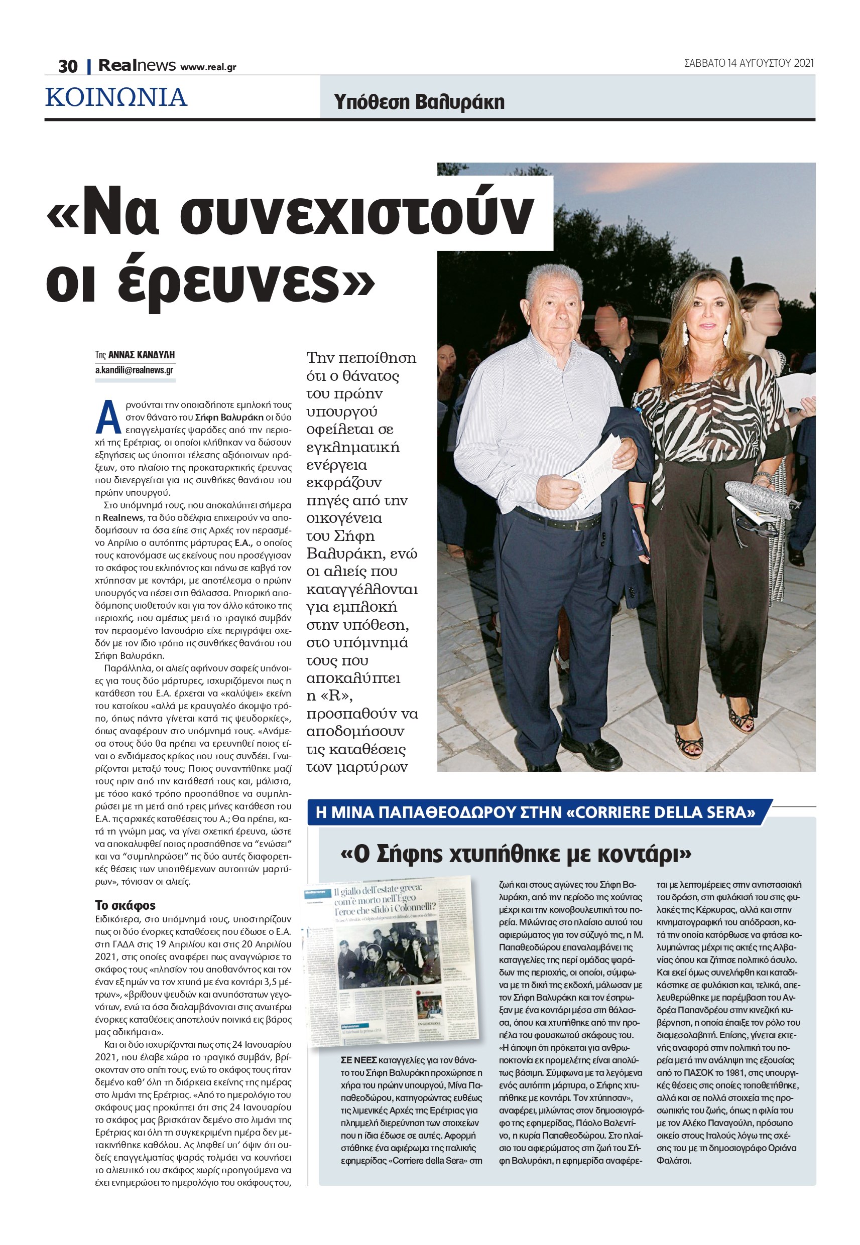 Σε νέες καταγγελίες για τον θάνατο του Σήφη Βαλυράκη προχώρησε η χήρα του πρώην υπουργού, Μίνα Παπαθεοδώρου, κατηγορώντας ευθέως τις λιμενικές Αρχές της Ερέτριας για πλημμελή διερεύνηση των στοιχείων που η ίδια έδωσε σε αυτές. Αφορμή στάθηκε ένα αφιέρωμα της ιταλικής εφημερίδας «Corriere della Sera» στη ζωή και στους αγώνες του Σήφη Βαλυράκη, από την περίοδο της χούντας μέχρι και την κοινοβουλευτική του πορεία. Μιλώντας στο πλαίσιο αυτού του αφιερώματος για τον σύζυγό της, η Μ. Παπαθεοδώρου επαναλαμβάνει τις καταγγελίες της περί ομάδας ψαράδων της περιοχής, οι οποίοι, σύμφωνα με τη δική της εκδοχή, μάλωσαν με τον Σήφη Βαλυράκη και τον έσπρωξαν με ένα κοντάρι μέσα στη θάλασσα, όπου και χτυπήθηκε από την προπέλα του φουσκωτού σκάφους του. «Η άποψη ότι πρόκειται για ανθρωποκτονία εκ προμελέτης είναι απολύτως βάσιμη. Σύμφωνα με τα λεγόμενα ενός αυτόπτη μάρτυρα, ο Σήφης χτυπήθηκε με κοντάρι. Τον χτύπησαν», αναφέρει, μιλώντας στον δημοσιογράφο της εφημερίδας, Πάολο Βαλεντίνο, η κυρία Παπαθεοδώρου. Στο πλαίσιο του αφιερώματος στη ζωή του Σήφη Βαλυράκη, η εφημερίδα αναφέρεται με λεπτομέρειες στην αντιστασιακή του δράση, στη φυλάκισή του στις φυλακές της Κέρκυρας, αλλά και στην κινηματογραφική του απόδραση, κατά την οποία κατόρθωσε να φτάσει κολυμπώντας μέχρι τις ακτές της Αλβανίας όπου και ζήτησε πολιτικό άσυλο. Και εκεί όμως συνελήφθη και καταδικάστηκε σε φυλάκιση και, τελικά, απελευθερώθηκε με παρέμβαση του Ανδρέα Παπανδρέου στην κινεζική κυβέρνηση, η οποία έπαιξε τον ρόλο του διαμεσολαβητή. Επίσης, γίνεται εκτενής αναφορά στην πολιτική του πορεία μετά την ανάληψη της εξουσίας από το ΠΑΣΟΚ το 1981, στις υπουργικές θέσεις στις οποίες τοποθετήθηκε, αλλά και σε πολλά στοιχεία της προσωπικής του ζωής, όπως η φιλία του με τον Αλέκο Παναγούλη, πρόσωπο οικείο στους Ιταλούς λόγω της σχέσης του με τη δημοσιογράφο Οριάνα Φαλάτσι.