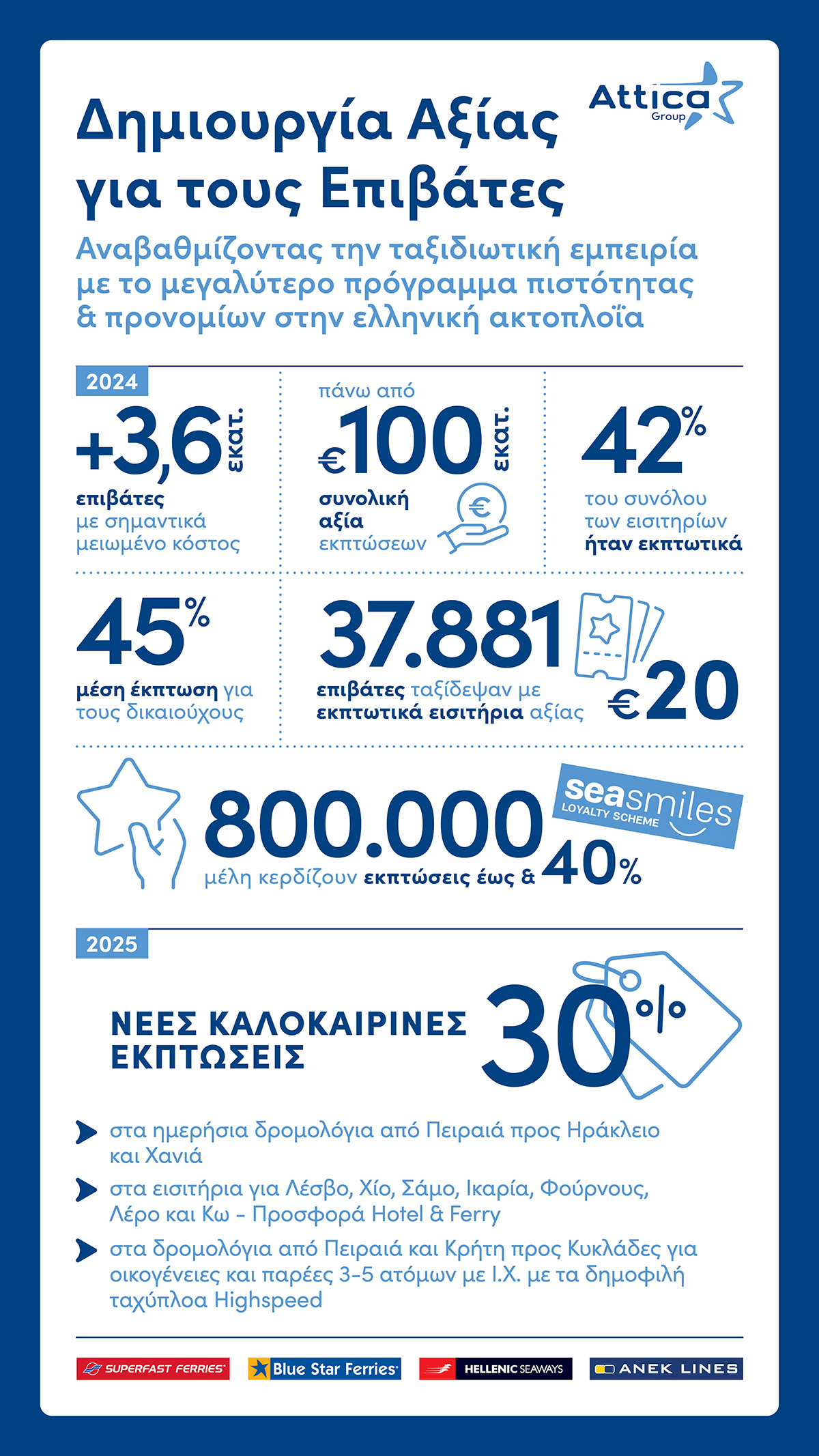 Αξίζει να σημειωθεί ότι το 2024 το 42% του συνόλου των εισιτηρίων με τα πλοία του Ομίλου Attica ήταν εκπτωτικά, ενώ η μέση έκπτωση για τους δικαιούχους έφτασε το 45%.