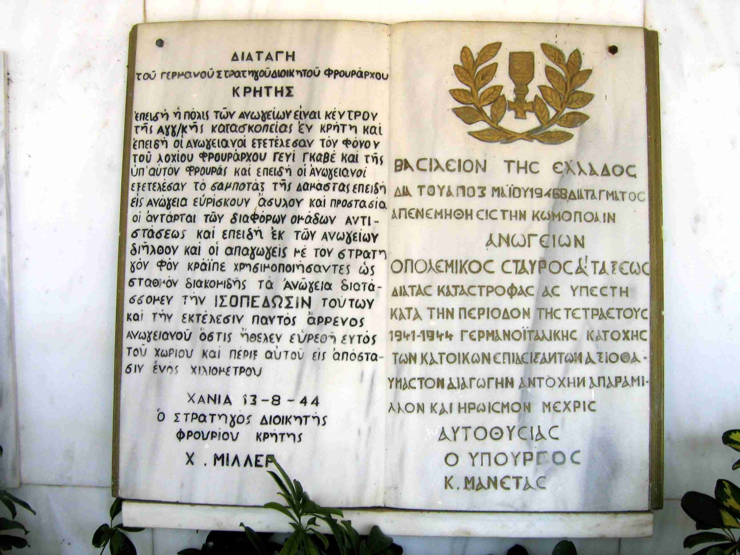 «Επειδή η πόλις των Ανωγείων είναι κέντρον της Αγγλικής κατασκοπείας εν Κρήτη και επειδή οι Ανωγειανοί εξετέλεσαν τον φόνον του λοχίου φρουράρχου Γενί Γκαβέ και της υπ’ αυτόν φρουράς και επειδή οι Ανωγειανοί εξετέλεσαν το σαμποτάζ της Δαμάστας, επειδή εις Ανώγεια ευρίσκουν άσυλον και προστασίαν οι αντάρται των διαφόρων ομάδων αντιστάσεως και επειδή εκ των Ανωγείων διήλθον και οι απαγωγείς με τον στρατηγόν φον Κράιπε, χρησιμοποιήσαντες ως σταθμόν διακομιδής τα Ανώγεια, διατάσσομεν την ΙΣΟΠΕΔΩΣΙΝ και την εκτέλεσιν παντός άρρενος Ανωγειανού, όστις ήθελεν ευρεθή εντός του χωρίου και πέριξ αυτού εις απόστασιν ενός χιλιομέτρου».