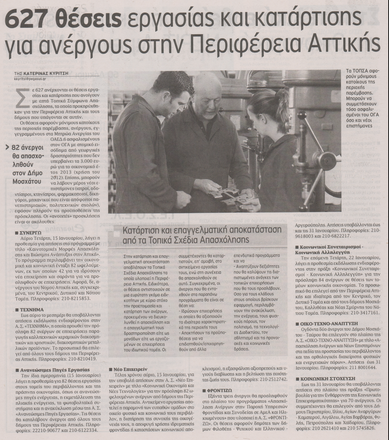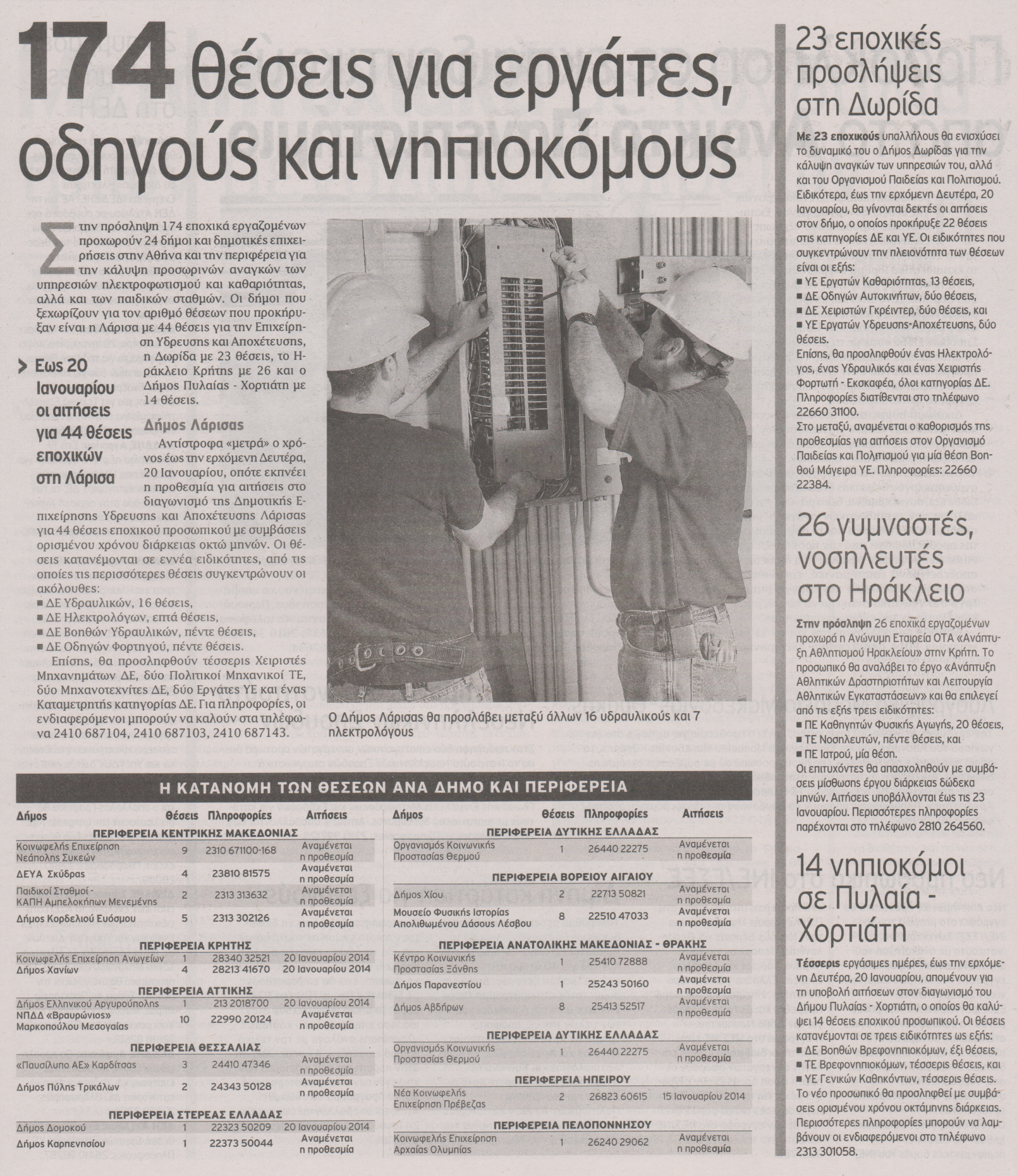 Σε 1.034 ανέρχονται οι «ανοικτές» θέσεις εργασίας που προσφέρονται αυτή την εβδομάδα σε δήμους, οργανισμούς, αλλά και εκπαιδευτικά ιδρύματα. Στη πρόσληψη 174 εποχικά εργαζόμενων προχωρούν 24 δήμοι σε Αθήνα και Περιφέρεια, ενώ 627 θέσεις κατάρτισης και απασχόλησης προσφέρουν οκτώ Αναπτυξιακές Συμπράξεις στο πλαίσιο των ΤΟΠΣΑ σε δήμους της Αττικής, όπως το Χαϊδάρι, η Φυλή, το Ελληνικό, η Φιλοθέη-Ψυχικό και σε άλλους δήμους της περιφερειακής ενότητας, ενώ στη ΔΕΗ θα προσληφθούν 26 ηλεκτροτεχνίτες δικτύων.