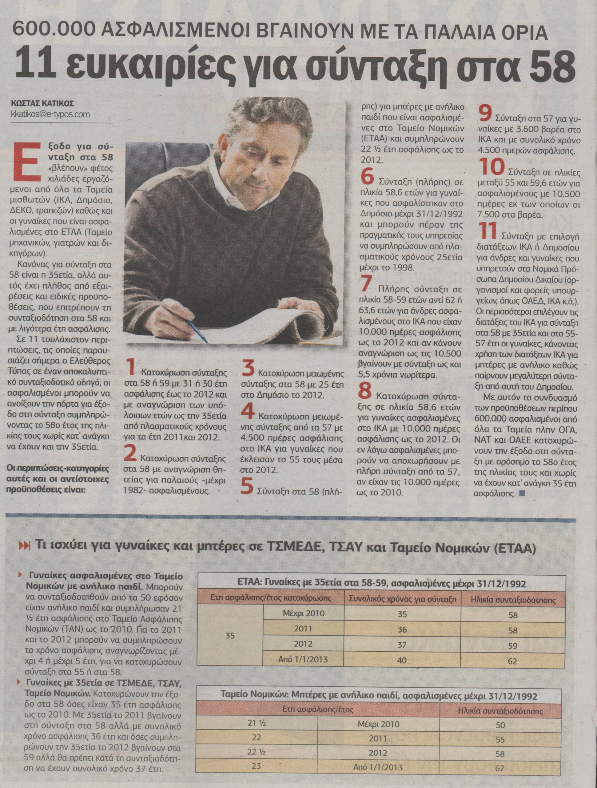 Έξοδο για σύνταξη στα 58 “βλέπουν” φέτος χιλιάδες εγραζόμενοι από όλα τα ταμεία μισθωτών (ΙΚΑ, Δημόσιο, ΔΕΚΟ, τραπεζών) καθώς και οι γυναίκες που είναι ασφαλισμένες στο ΕΤΑΑ (Ταμείο μηχανικών, γιατρών και δικηγόρων).