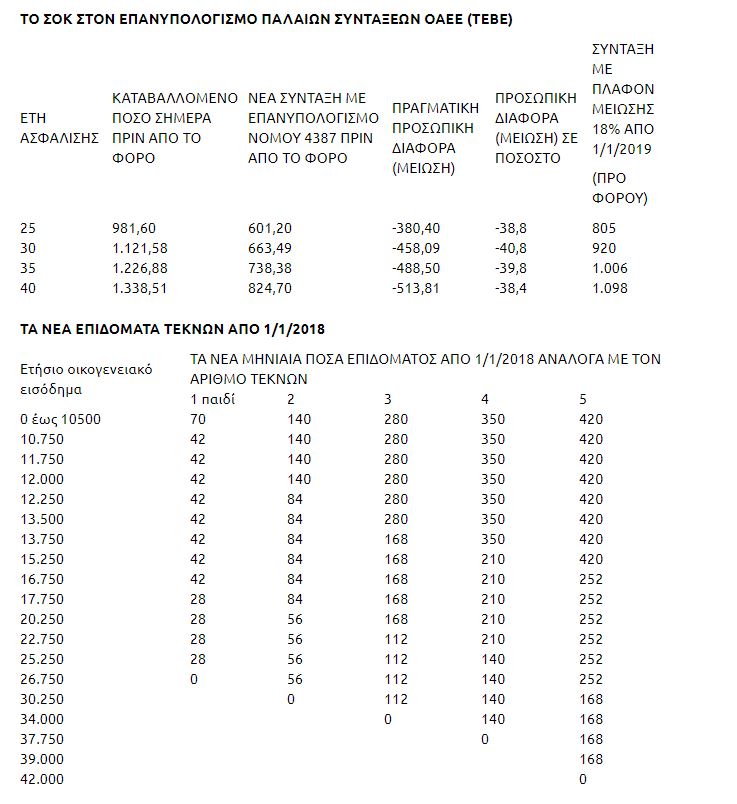 6 Τίθενται σε ισχύ τα νέα κριτήρια για τα επιδόματα τέκνων, με νέα μηνιαία ποσά 70 ευρώ για ένα παιδί, 140 για δυο, 280 ευρώ για τρία, 350 ευρώ για τέσσερα, 420 ευρώ για πέντε κ.ο.κ. Τα ως άνω πλήρη ποσά όμως τα λαμβάνουν όσοι έχουν ετήσιο εισόδημα ως 10.500 και ένα παιδί, ως 12.000 ευρώ με δυο παιδιά, ως 13.500 ευρώ με τρία παιδιά, ως 15.000 ευρώ με τέσσερα παιδιά ή ως 16.500 ευρώ με πέντε παιδιά. Για κάθε ενήλικα στην οικογένεια το βασικό εισόδημα προσαυξάνεται κατά ½ και για κάθε ανήλικο μέλος κατά ¼. Τα δε επιδόματα μετά τη βασική (πρώτη κατηγορία με τα πλήρη ποσά) μειώνονται στο 60% και στο 40% όσο ανεβαίνει το εισόδημα. Οσοι έχουν τρία και άνω παιδιά με ετήσιο εισόδημα πάνω από 33.750 ευρώ δεν θα παίρνουν επίδομα από το 2018, ενώ με το παλιό καθεστώς επιδοτούνταν για εισόδημα ως 45.000 ευρώ. Οι δε πολύτεκνοι (π.χ. με 5 παιδιά) επιδοτούνται αν έχουν εισόδημα ως 41.250 ευρώ ενώ με το παλιό καθεστώς επιδοτούνταν με όριο εισοδήματος ως 52.000 ευρώ. Τα επιδόματα καταβάλλονται: