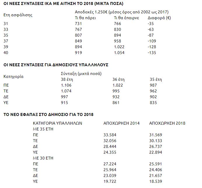 2 Ερχεται μεγαλύτερη μείωση συντάξεων για τους ασφαλισμένους που θα κάνουν αίτηση από 1/1/2018. Οι νέες συντάξεις υπολογίζονται ως προς το ανταποδοτικό ποσό, με βάση το μέσο όρο μηνιαίων μικτών αποδοχών από το 2002 και μετά. Στο διάστημα αυτό μεσολαβούν και τα χρόνια των Μνημονίων (από το 2010 και μετά) που οι μισθοί έχουν υποχωρήσει ως και 40% σε πολλούς κλάδους της οικονομίας. Για τις αιτήσεις του 2019 η μείωση θα είναι αναλογικά μεγαλύτερη. Εργαζόμενος που βγήκε στη σύνταξη το 2017 με μέσο όρο αποδοχών 1.100 ευρώ και 35 έτη θα πάρει 371,91 ευρώ ανταποδοτική σύνταξη και 384 ευρώ από την εθνική, δηλαδή 755,91 ευρώ. Με μια μείωση μισθού και αίτηση το 2018 ο μέσος όρος αποδοχών μπορεί να βγει στα 1.000 ευρώ, οπότε αυτομάτως με τα 35 χρόνια θα πάρει 338 ευρώ ανταποδοτική και 384 ευρώ εθνική, δηλαδή 722 ευρώ τελική σύνταξη. Το 2019 θα είναι ακόμη λιγότερα και το 2020 πιο κάτω.