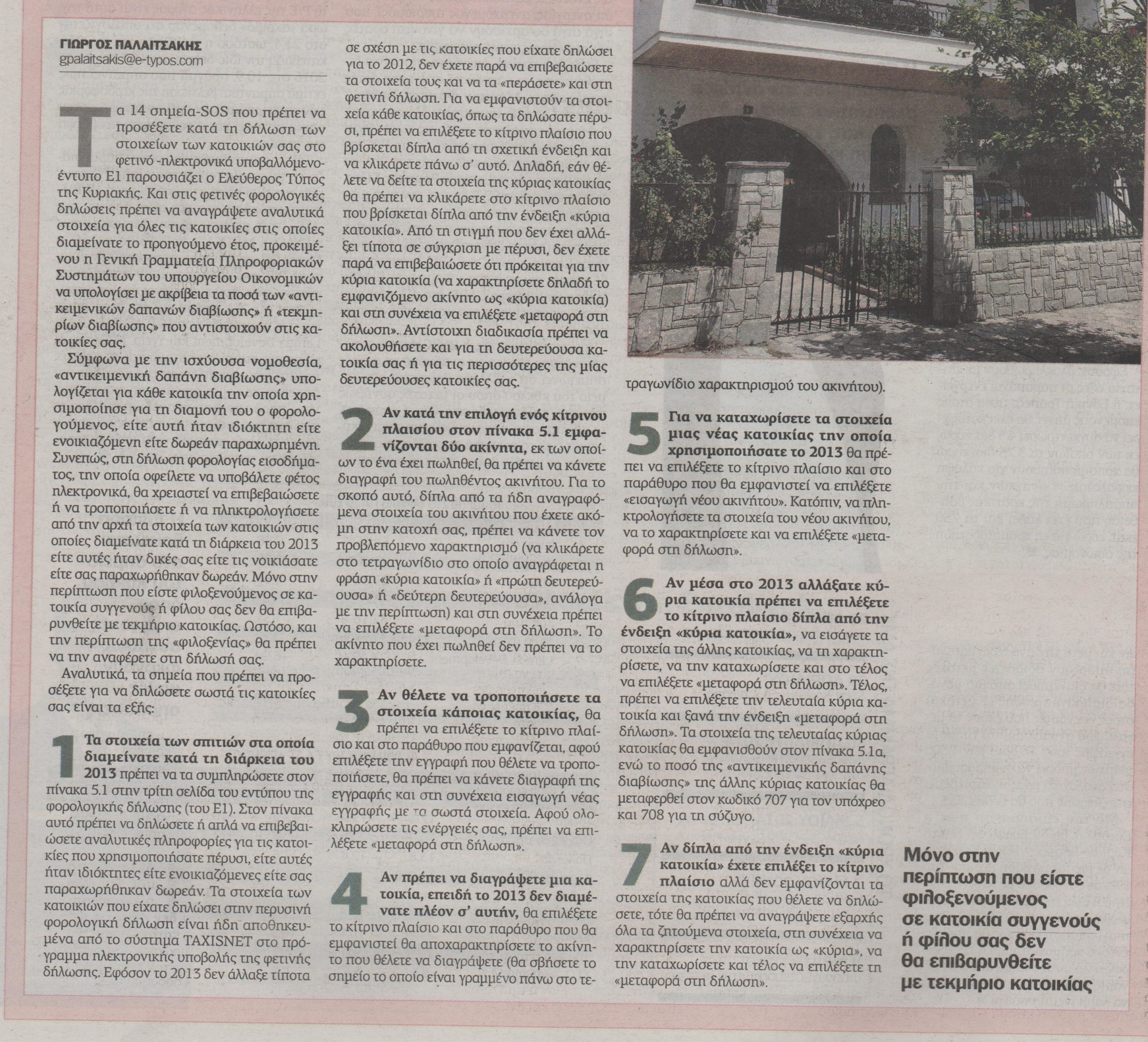 Τα 14 σημεία – SOS που πρέπει να προσέξετε κατά τη δήλωση των στοιχείων των κατοικιών σας στο φετινό – ηλεκτρονικά υποβαλλόμενο – έντυπο Ε1 παρουσιάζει ο Ελεύθερος Τύπος της Κυριακής.