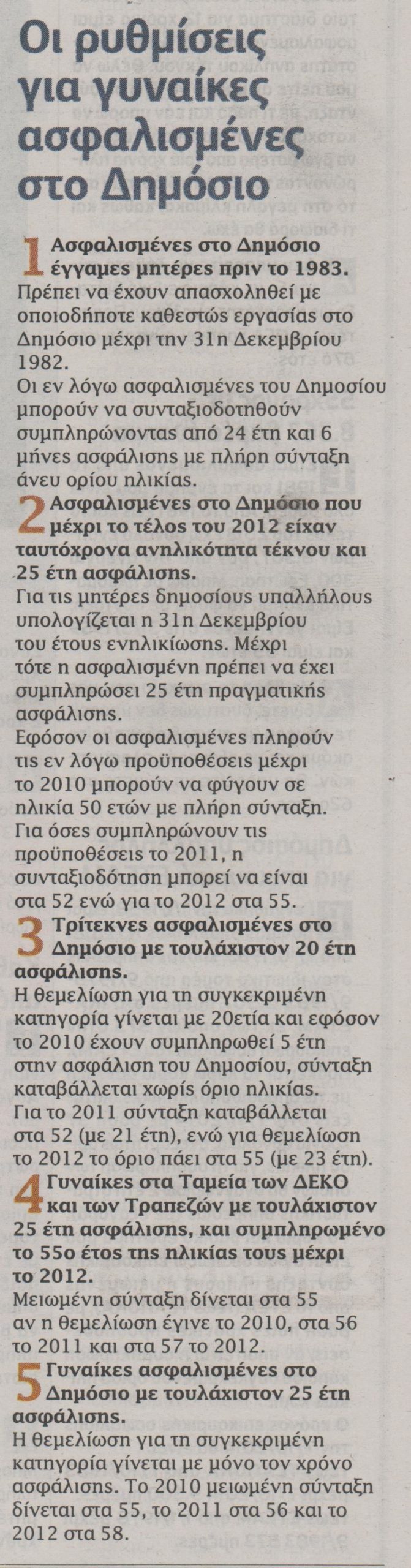 Συνταξιοδοτικές διατάξεις που καθιστούν εφικτή την έξοδο στη σύνταξη πριν τα 58 υπάρχουν στο Δημόσιο, στο ΙΚΑ, στα ταμεία των ΔΕΚΟ και των τραπεζών και στον φορέα των νομικών. Θετικές διατάξεις εφαρμόζονται μεταξύ άλλων για γονείς ανηλίκων, τριτέκνους αλλά και εργαζόμενους στα βαρέα και ανθυγιεινά επαγγέλματα.