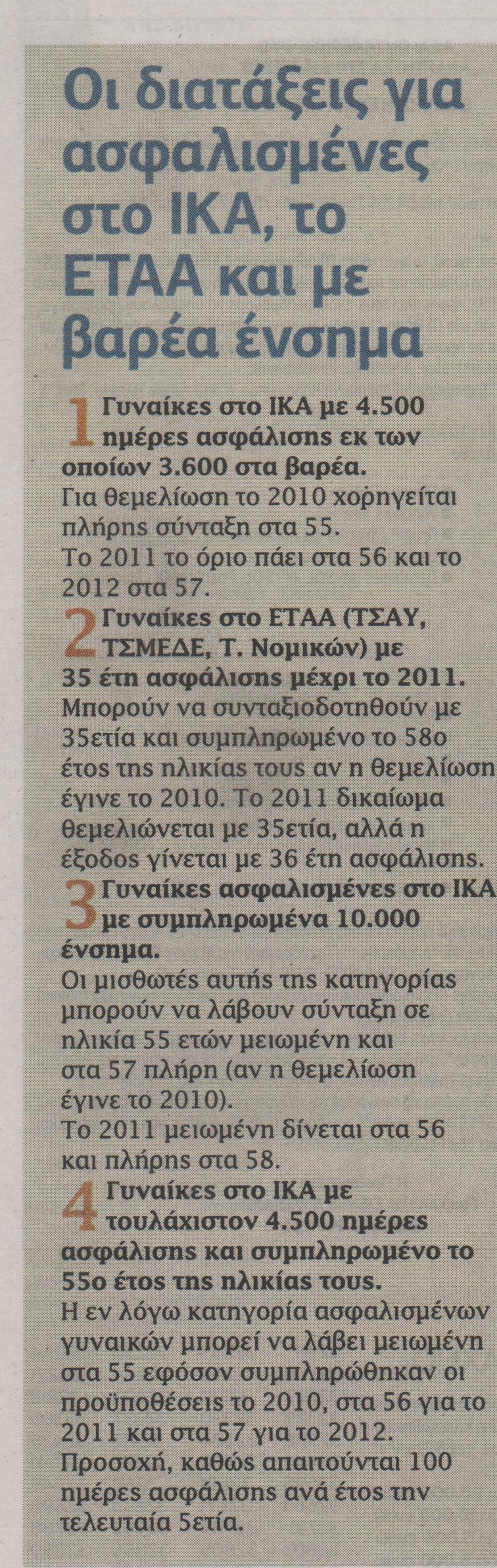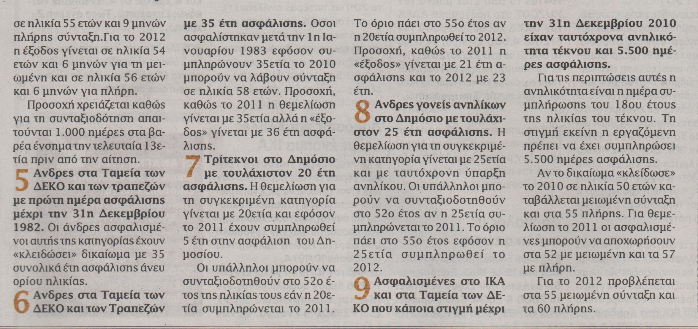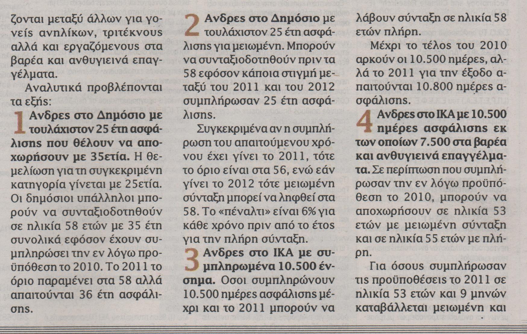 Όσοι άνδρες ασφαλισμένοι στο ΙΚΑ συμπληρώνουν 10.500 ημέρες ασφάλισης μέχρι και το 2011 μπορούν να λάβουν πλήρη σύνταξη σε ηλικία 58 ετών.