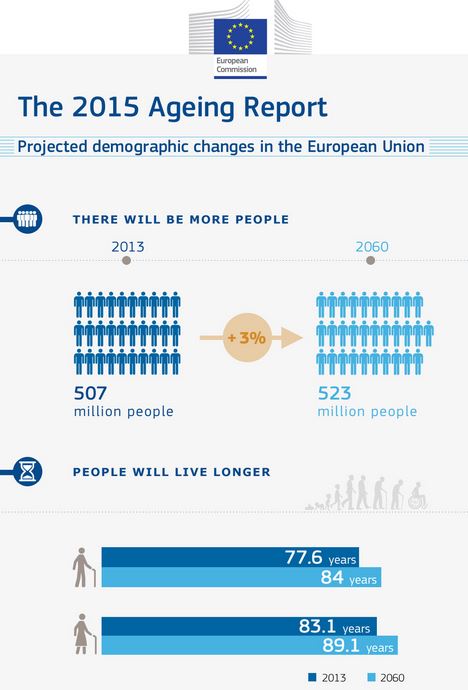 Το 2060, θα υπάρχουν μόνο δύο εργαζόμενοι για κάθε άτομο ηλικίας 65 ετών και άνω. Η έκθεση παραδέχεται ότι η μετανάστευση θα πρέπει να δώσει μια χείρα βοηθείας, μολονότι εκατοντάδες μετανάστες πνίγονται στη Μεσόγειο από την πολιτική των κλειστών συνόρων. Υπολογίζει πως ο πληθυσμός σχεδόν στα μισά κράτη-μέλη της ΕΕ αναμένεται να συρρικνωθεί.