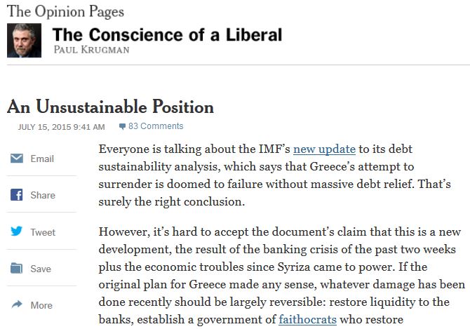 Όλοι μιλάνε για την νέα έκθεση του Διεθνούς Νομισματικού Ταμείου για την βιωσιμότητα του ελληνικού χρέους, που υποστηρίζει ότι η προσπάθεια της Ελλάδας να παραδοθεί είναι καταδικασμένη να αποτύχει χωρίς μια τεράστια ελάφρυνση χρέους. Πρόκειται σίγουρα για το σωστό συμπέρασμα, σημειώνει ο Πολ Κρούγκμαν.