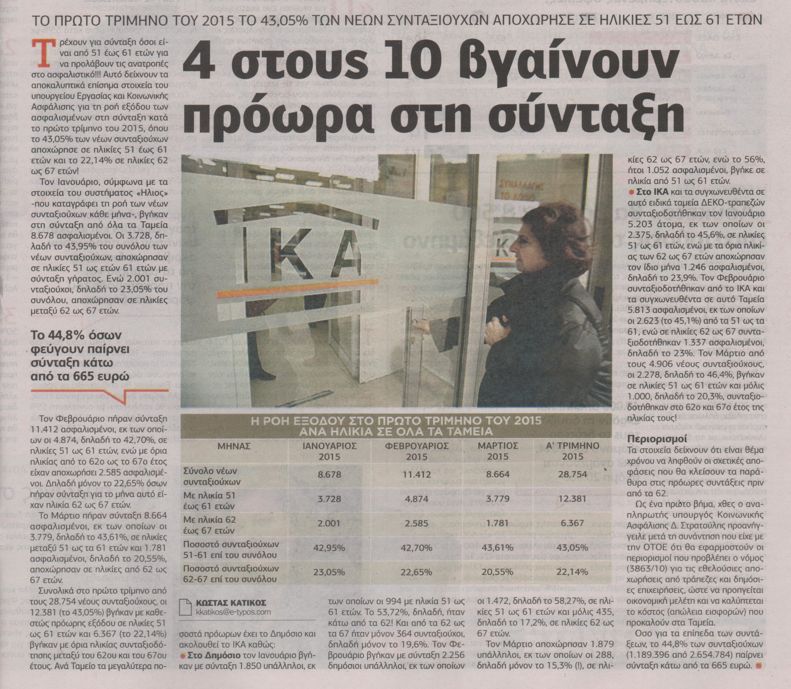 Αυτό δείχνουν τα αποκαλυπτικά επίσημα στοιχεία του υπουργείου Εργασίας και Κοινωνικής Ασφάλισης για τη ροή εξόδου των ασφαλισμένων στη σύνταξη κατά το πρώτο τρίμηνο του 2015, όπου το 43,05% των νέων συνταξιούχων αποχώρησε σε ηλικίες 51 έως 61 ετών και το 22,14% σε ηλικίες 62 έως 67 ετών.