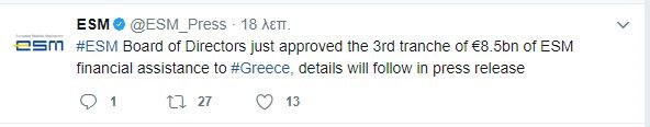 Την έγκριση της τρίτης δόσης του προγράμματος ύψους 8,5 δισ. από το Διοικητικό του Συμβούλιο, ανακοίνωσε ο Ευρωπαϊκός Μηχανισμός Σταθερότητας μέσω Twitter. «To ΔΣ τουESM μόλις ενέκρινε την τρίτη δόση 8,5 δισ. της οικονομικής βοήθειας προς την Ελλάδα» ήταν η ανάρτηση του ESM στο Twitter.