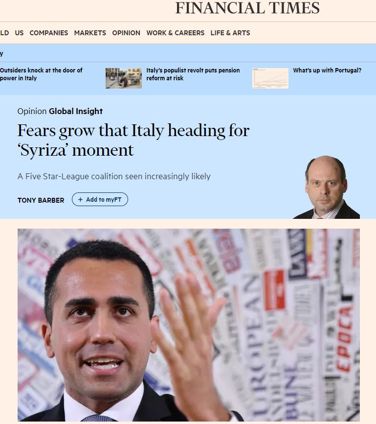 Οι οικονομικές συνθήκες στην Ιταλία σήμερα είναι πιο ευνοϊκές από εκείνες στην Ελλάδα το 2015, σύμφωνα με τους Financial Times. Η οικονομία αναπτύσσεται. Η χώρα πραγματοποιεί πρωτογενή πλεονάσματα κάθε χρόνο. Το προφίλ χρέους της Ιταλίας είναι σταθερό: οι μέσες διάρκειες είναι περίπου επτά έτη. Ωστόσο, οι κίνδυνοι είναι απλοί. Το παλιό, φιλοευρωπαϊκό σύστημα της Ιταλίας “σπάει”. Εάν βρίσκονται στην εξουσία, ένας συνασπισμός με το Κίνημα των Πέντε Αστεριών, ενδέχεται να αντιστρέψουν τις πρόσφατες οικονομικές μεταρρυθμίσεις και να αυξήσουν τα δημοσιονομικά ελλείμματα ακριβώς όπως η ΕΚΤ λύει τα υποστηρικτικά της μέτρα. Σε εκείνο το σημείο, ίσως στα τέλη του 2019 ή το πρώτο εξάμηνο του 2020, η ευρωζώνη μπορεί να εκτιμήσει την αλήθεια της παλιάς παροιμιάς ότι οι χρηματοπιστωτικές αγορές είναι ήρεμες… μέχρι να μην είναι.