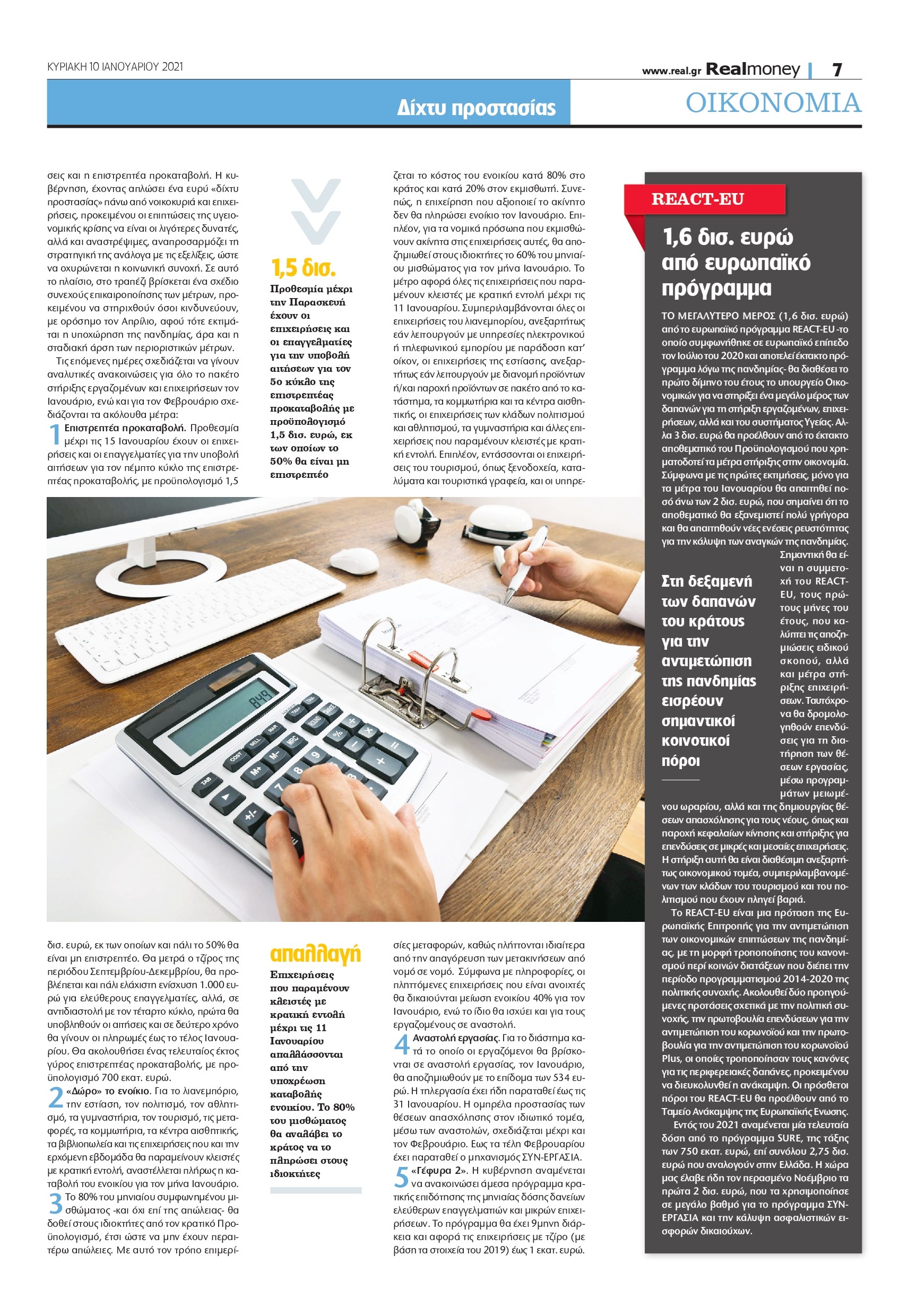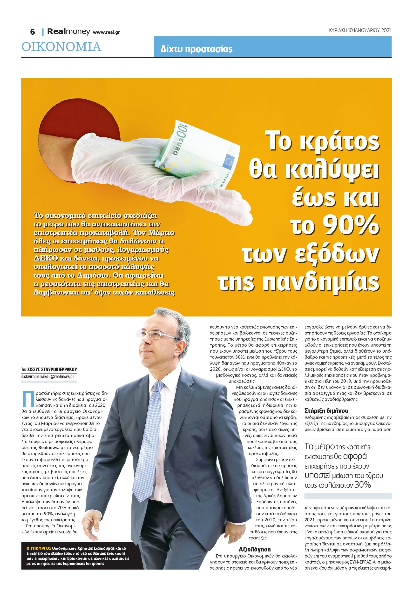 Προσκλητήριο στις επιχειρήσεις να δηλώσουν τις δαπάνες που πραγματοποίησαν κατά τη διάρκεια του 2020 θα απευθύνει το υπουργείο Οικονομικών το επόμενο διάστημα, προκειμένου εντός του Μαρτίου να ενεργοποιηθεί το νέο στοχευμένο εργαλείο που θα διαδεχθεί την επιστρεπτέα προκαταβολή. Σύμφωνα με ασφαλείς πληροφορίες της Realnews, με το νέο μέτρο θα στηριχθούν οι επιχειρήσεις που έχουν επιβαρυνθεί περισσότερο από τις συνέπειες της υγειονομικής κρίσης, με βάση τις απώλειες που έχουν υποστεί, αλλά και τον όγκο των δαπανών που πραγματοποίησαν για την κάλυψη των άμεσων υποχρεώσεών τους. Η κάλυψη των δαπανών μπορεί να φτάσει στο 70% ή ακόμα και στο 90%, ανάλογα με το μέγεθος της επιχείρησης. Στο υπουργείο Οικονομικών έχουν αρχίσει να εξειδικεύουν το νέο καθεστώς ενίσχυσης των επιχειρήσεων και βρίσκονται σε τεχνικές συζητήσεις με τις υπηρεσίες της Ευρωπαϊκής Επιτροπής. Το μέτρο θα αφορά επιχειρήσεις που έχουν υποστεί μείωση του τζίρου τους τουλάχιστον 30%, ενώ θα προβλέπει την κάλυψη δαπανών που πραγματοποιήθηκαν το 2020, όπως είναι οι λογαριασμοί ΔEKO, το μισθολογικό κόστος, αλλά και δανειακές υποχρεώσεις. Μη καλυπτόμενες πάγιες δαπάνες θεωρούνται οι πάγιες δαπάνες που πραγματοποίησαν οι επιχειρήσεις κατά τη διάρκεια της περασμένης χρονιάς που δεν καλύπτονται ούτε από τα κέρδη, τα οποία δεν είχαν λόγω της κρίσης, ούτε από άλλες πηγές, όπως είναι τυχόν ποσά που έχουν λάβει από τους κύκλους της επιστρεπτέας προκαταβολής. Σύμφωνα με τον σχεδιασμό, οι επιχειρήσεις και οι επαγγελματίες θα κληθούν να δηλώσουν σε ηλεκτρονική πλατφόρμα της Ανεξάρτητης Αρχής Δημοσίων Εσόδων τις δαπάνες που πραγματοποίησαν κατά τη διάρκεια του 2020, τον τζίρο τους, αλλά και τις καταθέσεις που έχουν στις τράπεζες.